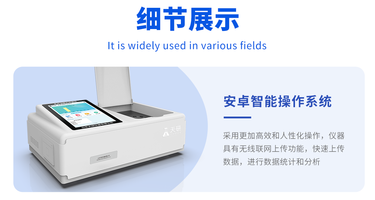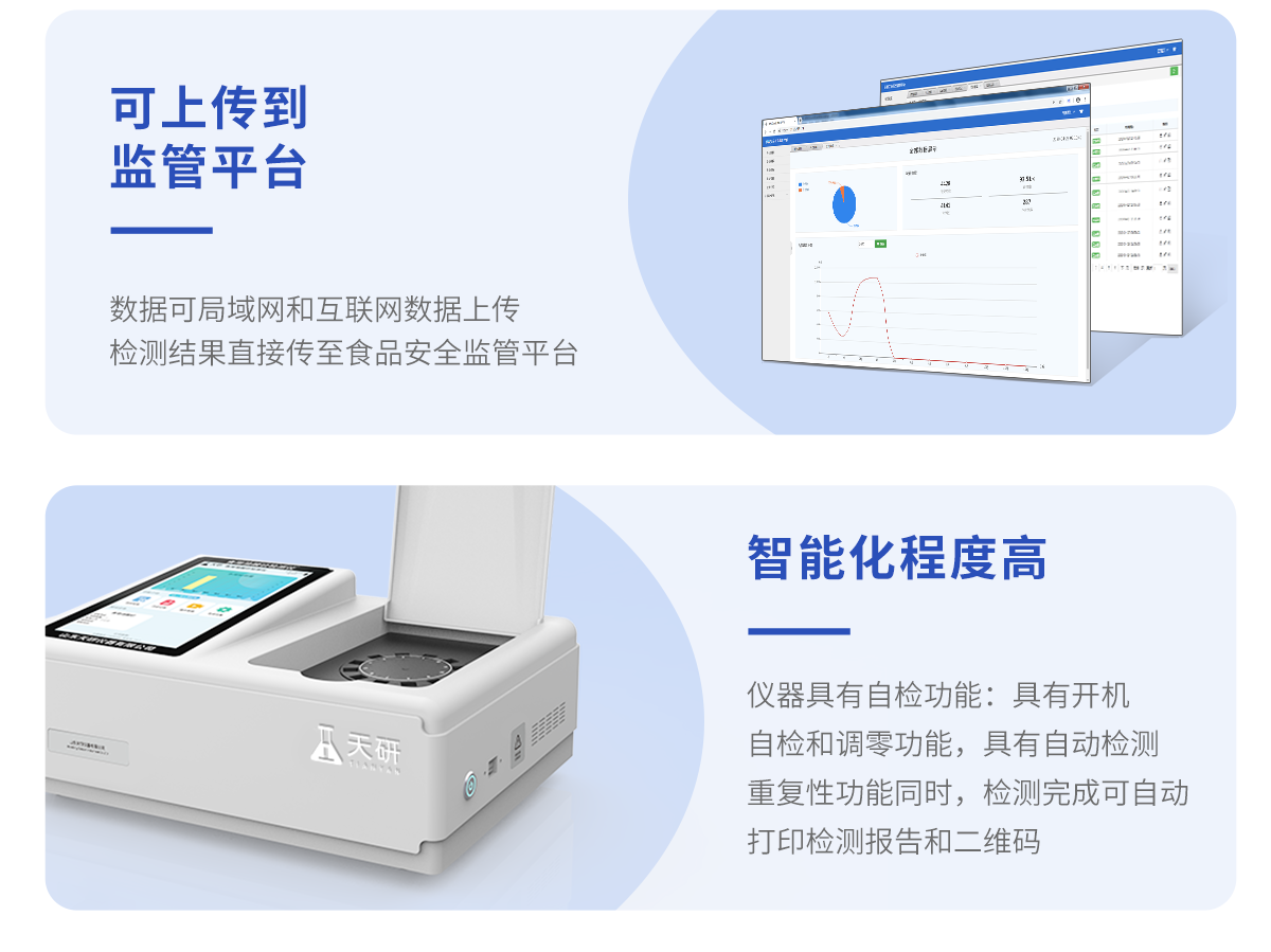 | 儀器采用臺式一體化系統(tǒng)檢測技術,將分光光度模塊、新型農(nóng)殘檢測模塊、數(shù)字化管理模塊、無線通訊模塊高度集成于一體,支持檢測200種食品安全檢測項目,同時預留升級檢測方法。 | 儀器檢測模塊標準化、智能化,可隨意自由組合。檢測箱體內(nèi)置多個標準檢測單元,檢測模塊可以調(diào)整配置。 | 儀器采用全新安卓智能系統(tǒng),主控芯片采用 ARM Cortex-A7,RK3288/4核處理器,10.1寸高清液晶觸摸豎屏,更加**的UI交互界面,運轉快捷;儀器配備無線通信模塊: 4G(APN)通訊模塊、Wifi模塊,藍牙傳輸,同時具有雙USB接口以及RJ45接口能以多種方式實現(xiàn)數(shù)據(jù)保存和數(shù)據(jù)傳輸功能。 | 創(chuàng)新檢測模式: | ★檢測通道:≥12通道;采用精密旋轉比色池設計,使用同芯片同光源校準精度,解決不同光源之間的誤差值。1-12通道間誤差0.1%。(專利號:ZL202022821055.2) | ★儀器具有自動識別比色皿檢測功能,即:將樣品比色皿放入儀器后,點擊樣品檢測,儀器自動識別比色皿進行通道檢測。 | 進口高精光源: | 高精度進口四波長冷光源,通道配置 410、520、590、630nm 波長光源,一個光源芯片驅動一個光源,誤差極小,每臺設備單獨**校準光源,**比對,同時參照四種不同波段光源全方位覆蓋市面上99%的農(nóng)殘食品項目檢測。 | 智能化操作系統(tǒng): | 便捷操作系統(tǒng):設備檢測時可在同一檢測界面自動對應相關檢測通道一次性選擇1-12個樣品名稱,無須退出界面,節(jié)省操作時間。 | 數(shù)據(jù)集成系統(tǒng):設備首頁自動統(tǒng)計檢測數(shù)據(jù)包含:周檢測數(shù)據(jù)、月檢測數(shù)據(jù),全部檢測總數(shù)量,均包含檢測總數(shù),合格數(shù),不合格數(shù),以及相關柱形分析圖,對各項檢測數(shù)據(jù)清晰掌握,無需電腦查詢,更加快捷直觀。 | 項目預設系統(tǒng):支持添加單個及多個相同或不相同的任務預設,一鍵快速調(diào)取,每一個任務分別可以設置不同的樣品、批次、編號、來源、備注、抽樣信息、檢測信息、受檢信息、復核信息等更多信息。無縫鏈接平臺和APP實時查看下發(fā)任務。 | 數(shù)據(jù)監(jiān)管系統(tǒng):同步對接監(jiān)管平臺,數(shù)據(jù)可局域網(wǎng)和互聯(lián)網(wǎng)數(shù)據(jù)上傳,檢測結果可選擇直接傳至食品安全監(jiān)管平臺。集成OSS輸出存儲服務、區(qū)分設備定向管理應用,進行區(qū)域食品安全監(jiān)管及大數(shù)據(jù)分析處理與數(shù)據(jù)統(tǒng)計,檢測區(qū)域食品安全長短期動態(tài),達到食品安全問題預估、預警。 | 自定義打印系統(tǒng):內(nèi)置全新打印系統(tǒng),新創(chuàng)自定義打印方式,可按需靈活設置開啟或關閉:產(chǎn)品合格證(國家農(nóng)業(yè)部標準要求),二維碼,抽樣信息、檢測信息,受檢信息、復核信息、抽樣日期、檢測日期等信息的打印。 | 系統(tǒng)遠程更新功能:可定向分客戶分儀器更新系統(tǒng),按照不同客戶后期實際需求添加項目,無需機器返廠,即可遠程實時升級全新系統(tǒng),節(jié)省時間成本及避免運輸造成設備損壞。 | 儀器主機采用一體化防水、抗壓、防撞擊、防腐蝕箱體設計,同時配備交直流供電,可連接車載電源,可選配大容量充電鋰電池,滿足現(xiàn)場野外檢測需求。 | 安全證書,放心保障:儀器具有中國計量科學研究院校準證書,**認證。 |