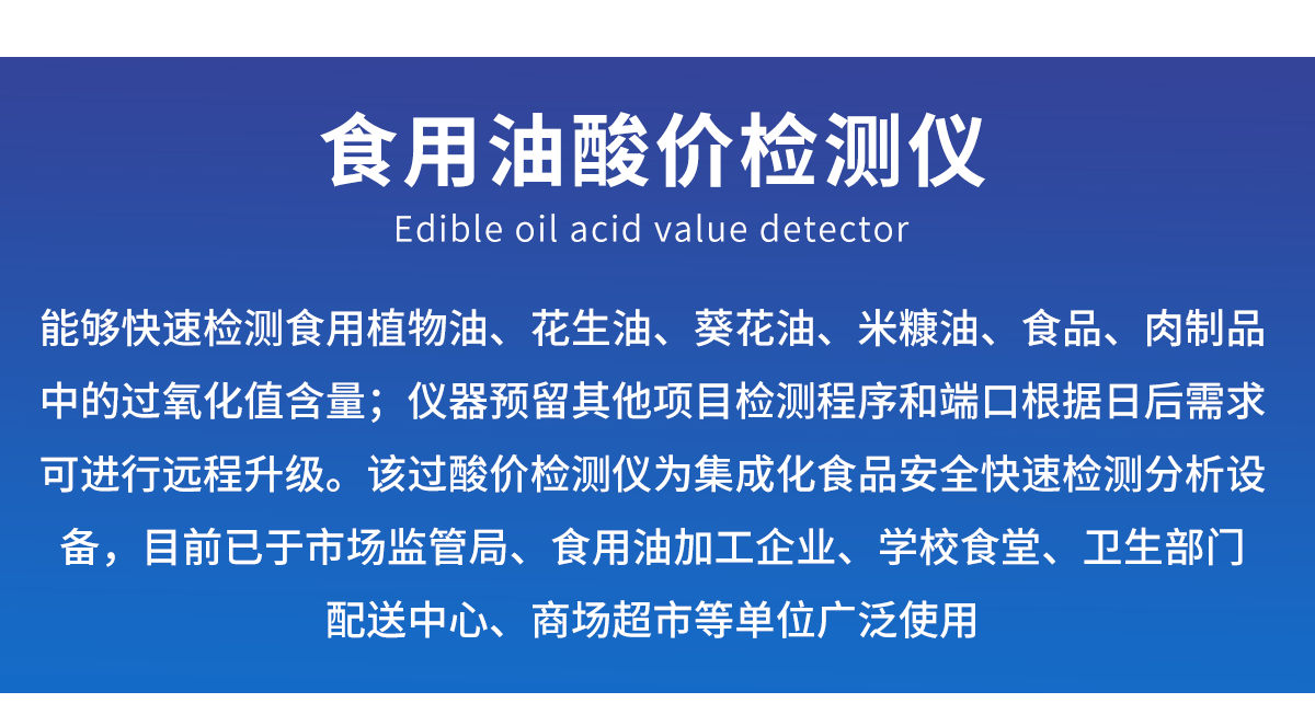 廣泛應用于質量監(jiān)督檢驗、工商管理、油炸食品生產(chǎn)基地、食藥監(jiān)局、衛(wèi)生部門、肉制品食品深加工企業(yè)、商場超市、各大食品安全監(jiān)測系統(tǒng)等單位使用。