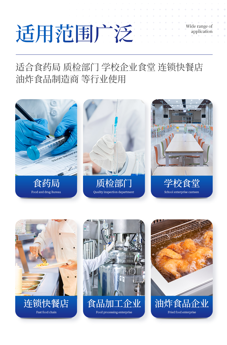 廣泛應(yīng)用于質(zhì)量監(jiān)督檢驗(yàn)、工商管理、油炸食品生產(chǎn)基地、食藥監(jiān)局、衛(wèi)生部門、肉制品食品深加工企業(yè)、商場(chǎng)超市、各大食品安全監(jiān)測(cè)系統(tǒng)等單位使用。
