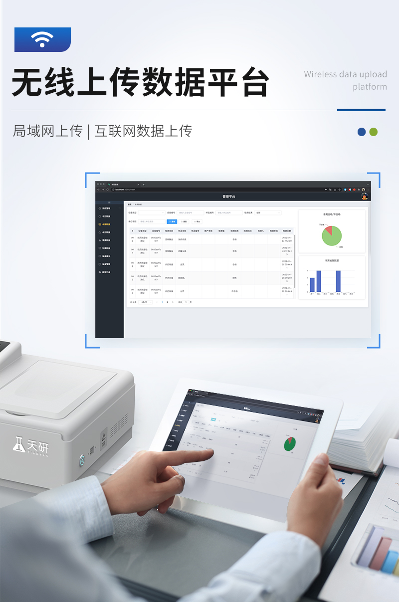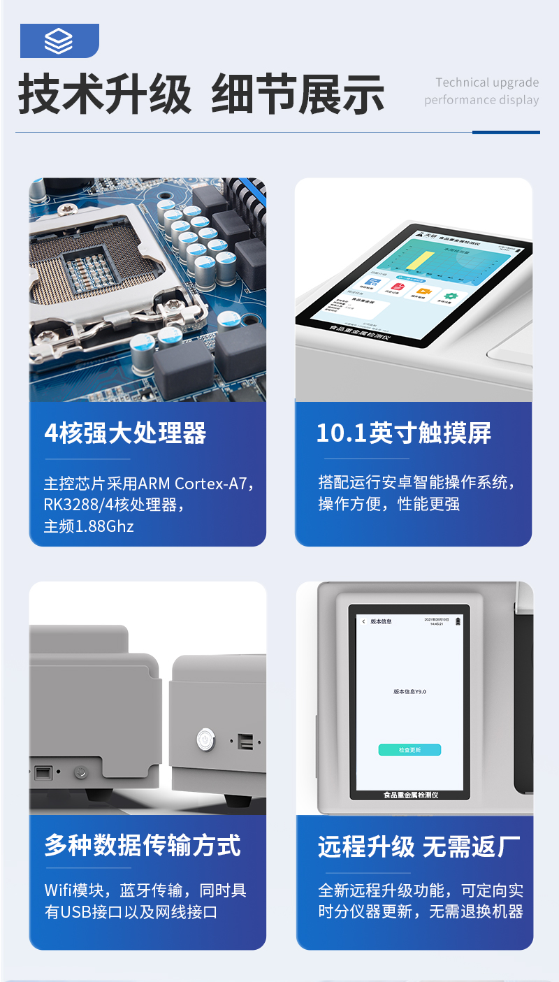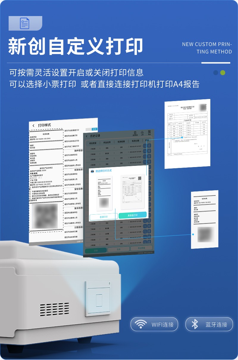 | 儀器采用臺式一體化系統(tǒng)檢測技術,將分光光度模塊、數字化管理模塊、無線通訊模塊高度集成于一體,可支持檢測60種食品安全檢測項目,同時預留升級檢測方法。 | 儀器檢測模塊標準化、智能化,檢測項目可隨意自由組合。檢測箱體內置多個標準檢測單元,檢測模塊可以調整配置。 | 儀器采用全新安卓智能系統(tǒng),主控芯片采用 ARM Cortex-A7,RK3288/4核處理器,10.1寸高清液晶觸摸豎屏,更加**的UI交互界面,運轉快捷;儀器配備無線通信模塊: 4G(APN)通訊模塊、Wifi模塊,藍牙傳輸,同時具有雙USB接口以及RJ45接口能以多種方式實現(xiàn)數據保存和數據傳輸功能。 | 顯示屏幕:儀器采用10.1英寸豎向液晶觸摸屏顯,搭配運行安卓智能操作系統(tǒng),主控芯片采用ARM Cortex-A7,RK3288/4核處理器,主頻1.88Ghz,操作方便,性能更強。 | 檢測通道:≥12通道;采用精密旋轉比色池設計,使用同芯片同光源校準精度,解決不同光源之間的誤差值,更加準確**。(1-12通道間誤差0.1%,專利號:ZL202022821055.2) | 儀器光源:高精度進口四波長冷光源,每個通道均配置 410、520、590、630nm 波長光源,標配**的光路切換裝置,專利光路切換功能可實現(xiàn)64波長,并且所有檢測項目可實現(xiàn)所有通道同時檢測。 | 設備可一鍵校準,自動保存校準數據,自動對比校驗,得到精準光源,采用Android SP存儲數據,光源數據永不丟失,方便每一次使用。 | 通訊接口:配備無線通信模塊、4G(APN)通訊模塊、藍牙傳輸,同時具有雙USB接口以及RJ45網線接口,可以多方式實現(xiàn)數據保存及數據傳輸。 | 存儲方式:支持U盤存儲,標準USB接口,免驅動安裝。檢測結果存儲容量20萬條以上,可生成Excel表格進行拷貝,并具有登錄保護功能。 | 智能化操作系統(tǒng): | 1、操作系統(tǒng):儀器可在同一檢測界面自動對應相關檢測通道,一次性選擇1-12個樣品名稱,無需退出界面,節(jié)省操作時間。并可以對每個通道屬性和樣品信息單獨進行編輯,例如送檢單位、人員,檢測人員等,打印時勾選打印顯示。 | 2、數據集成系統(tǒng):設備首頁自動匯總分析檢測數據,包含:周檢測數據、月檢測數據,全部檢測總數量,均包含檢測總數,合格數,不合格數,以及相關柱形分析圖,各項檢測數據一目了然,無需電腦查詢,更加快捷直觀。 | 3、數據庫系統(tǒng):十幾項數據庫分類管理儀器:包含項目類型、項目數據、檢測數據、歷史記錄、國標信息、曲線信息、采樣信息、檢測信息、受檢信息、復核信息、圖表信息、光源校準信息、打印樣式信息、樣品庫信息等等,數據庫之間互相協(xié)調聯(lián)動保證數據的真實完整性。同時產品數據庫以及歷史檢測記錄支持一鍵檢索功能。 | 4、限量規(guī)判系統(tǒng):具有限量查詢、添加物質合規(guī)判定系統(tǒng)。檢測出結果后,系統(tǒng)自動調用系統(tǒng)數據庫中相關國標進行比對判定,客觀顯示判定結果是否合格。 | 5、項目預設系統(tǒng):儀器具有任務預設模塊,一鍵提前預設,給出方便快捷的新檢測方案,每一個任務分別可以設置不同的樣品、批次、編號、來源、備注、抽樣信息、檢測信息、受檢信息、復核信息等更多信息。樣品送檢時一鍵調取保存信息,并可多次調取,大大提高檢測效率。 | 6、數據監(jiān)管系統(tǒng):同步對接監(jiān)管平臺,數據可局域網和互聯(lián)網數據上傳,檢測結果可選擇直接傳至食品安全監(jiān)管平臺。進行區(qū)域食品安全監(jiān)管及大數據分析處理與數據統(tǒng)計,檢測區(qū)域食品安全長短期動態(tài),達到食品安全問題預估、預警。 | 7、全新打印系統(tǒng):內置全新打印機,新創(chuàng)自定義打印方式,可按需靈活勾選控制:二維碼,抽樣信息、檢測信息,受檢信息、復核信息、抽樣日期、檢測日期等信息的打印。 | 8、A4紙版本報告打印功能(可選配):設備擁有兩種結果展示方式,可以自動生成A4打印模板和小票打印模板兩種樣式,可通過WiFi及網線等方式鏈接外置打印機可進行打印。 | 供電模式:儀器交直流兩用,直流12V供電,可連接車載電源,可配6ah大容量充電鋰電池,電量可實時顯示,方便戶外流動測試。 | 儀器具備遠程升級功能,可定向分客戶分儀器更新,開機后自動更新,并可持續(xù)性免費更新系統(tǒng)版本,無需像傳統(tǒng)產品返廠更新,節(jié)省時間及人力成本并避免了物流運輸返廠升級導致設備損壞的潛在風險。 |