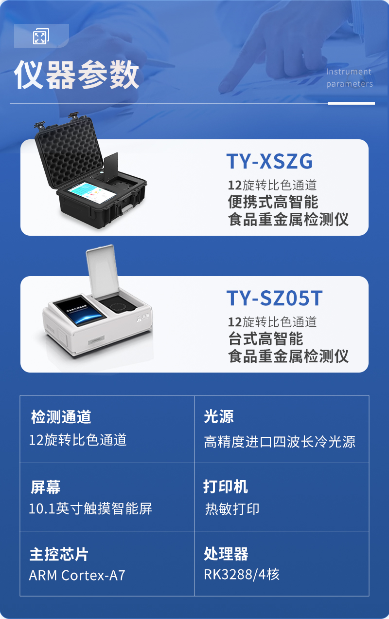 儀器用途: 山東天研儀器有限公司生產的重金屬檢測儀為集成化食品安全快速檢測分析設備,采用臺式一體化設計,重金屬檢測儀可廣泛應用于大米、糧谷、果品、蔬菜、藥材、水產品中重金屬鉛、鎘、六價鉻、汞、砷、鐵、鎳、鋁等項目進行快速定量檢測,檢測項目可根據客戶的需求定制,儀器預留其他項目檢測程序和