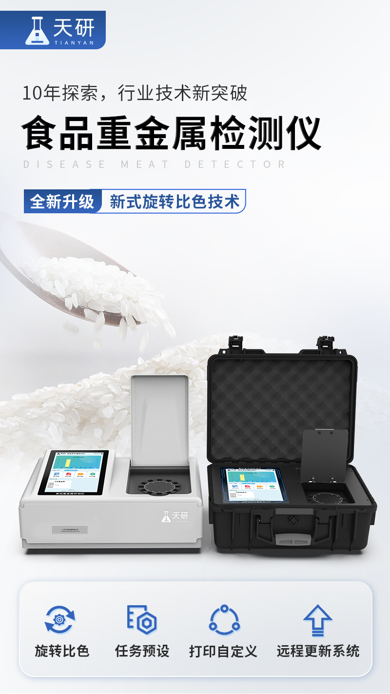 山東天研儀器有限公司生產(chǎn)的食品重金屬檢測儀為集成化食品安全快速檢測分析設(shè)備,采用手提箱一體化設(shè)計(jì),重金屬檢測儀可廣泛應(yīng)用于大米、糧谷、果品、蔬菜、藥材、水產(chǎn)品中重金屬鉛、鎘、六價(jià)鉻、汞、砷、鐵、鎳、鋁的快速檢測,檢測項(xiàng)目可根據(jù)日后需求可進(jìn)行遠(yuǎn)程升級(jí)。