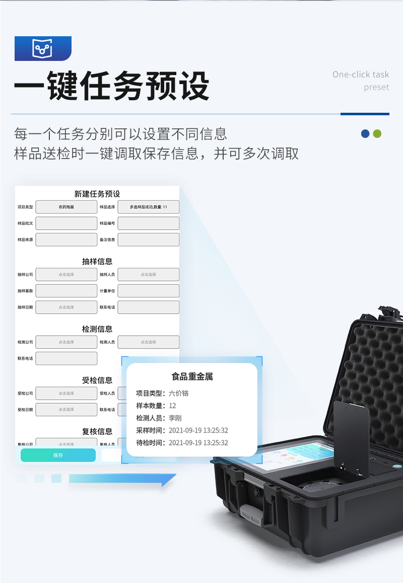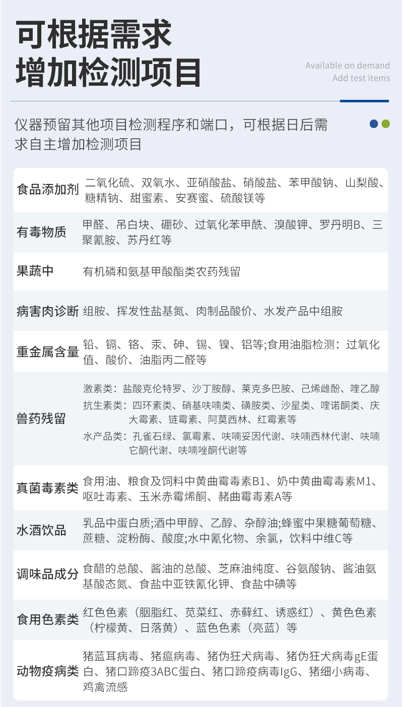 | 儀器采用手提一體化系統(tǒng)檢測技術(shù),將分光光度模塊、數(shù)字化管理模塊、無線通訊模塊高度集成于一體,可支持檢測60種食品安全檢測項(xiàng)目,同時(shí)預(yù)留升級(jí)檢測方法。 | 儀器檢測模塊標(biāo)準(zhǔn)化、智能化,檢測項(xiàng)目可隨意自由組合。檢測箱體內(nèi)置多個(gè)標(biāo)準(zhǔn)檢測單元,檢測模塊可以調(diào)整配置。 | 儀器采用全新安卓智能系統(tǒng),主控芯片采用 ARM Cortex-A7,RK3288/4核處理器,10.1寸高清液晶觸摸豎屏,更加**的UI交互界面,運(yùn)轉(zhuǎn)快捷;儀器配備無線通信模塊: 4G(APN)通訊模塊、Wifi模塊,藍(lán)牙傳輸,同時(shí)具有雙USB接口以及RJ45接口能以多種方式實(shí)現(xiàn)數(shù)據(jù)保存和數(shù)據(jù)傳輸功能。 | 顯示屏幕:儀器采用10.1英寸豎向液晶觸摸屏顯,搭配運(yùn)行安卓智能操作系統(tǒng),主控芯片采用ARM Cortex-A7,RK3288/4核處理器,主頻1.88Ghz,操作方便,性能更強(qiáng)。 | 檢測通道:≥12通道;采用精密旋轉(zhuǎn)比色池設(shè)計(jì),使用同芯片同光源校準(zhǔn)精度,解決不同光源之間的誤差值,更加準(zhǔn)確**。(1-12通道間誤差0.1%,專利號(hào):ZL202022821055.2) | 儀器光源:高精度進(jìn)口四波長冷光源,每個(gè)通道均配置 410、520、590、630nm 波長光源,標(biāo)配**的光路切換裝置,專利光路切換功能可實(shí)現(xiàn)64波長,并且所有檢測項(xiàng)目可實(shí)現(xiàn)所有通道同時(shí)檢測。 | 設(shè)備可一鍵校準(zhǔn),自動(dòng)保存校準(zhǔn)數(shù)據(jù),自動(dòng)對(duì)比校驗(yàn),得到精準(zhǔn)光源,采用Android SP存儲(chǔ)數(shù)據(jù),光源數(shù)據(jù)永不丟失,方便每一次使用。 | 通訊接口:配備無線通信模塊、4G(APN)通訊模塊、藍(lán)牙傳輸,同時(shí)具有雙USB接口以及RJ45網(wǎng)線接口,可以多方式實(shí)現(xiàn)數(shù)據(jù)保存及數(shù)據(jù)傳輸。 | 存儲(chǔ)方式:支持U盤存儲(chǔ),標(biāo)準(zhǔn)USB接口,免驅(qū)動(dòng)安裝。檢測結(jié)果存儲(chǔ)容量20萬條以上,可生成Excel表格進(jìn)行拷貝,并具有登錄保護(hù)功能。 | 智能化操作系統(tǒng): | 1、操作系統(tǒng):儀器可在同一檢測界面自動(dòng)對(duì)應(yīng)相關(guān)檢測通道,一次性選擇1-12個(gè)樣品名稱,無需退出界面,節(jié)省操作時(shí)間。并可以對(duì)每個(gè)通道屬性和樣品信息單獨(dú)進(jìn)行編輯,例如送檢單位、人員,檢測人員等,打印時(shí)勾選打印顯示。 | 2、數(shù)據(jù)集成系統(tǒng):設(shè)備首頁自動(dòng)匯總分析檢測數(shù)據(jù),包含:周檢測數(shù)據(jù)、月檢測數(shù)據(jù),全部檢測總數(shù)量,均包含檢測總數(shù),合格數(shù),不合格數(shù),以及相關(guān)柱形分析圖,各項(xiàng)檢測數(shù)據(jù)一目了然,無需電腦查詢,更加快捷直觀。 | 3、數(shù)據(jù)庫系統(tǒng):十幾項(xiàng)數(shù)據(jù)庫分類管理儀器:包含項(xiàng)目類型、項(xiàng)目數(shù)據(jù)、檢測數(shù)據(jù)、歷史記錄、國標(biāo)信息、曲線信息、采樣信息、檢測信息、受檢信息、復(fù)核信息、圖表信息、光源校準(zhǔn)信息、打印樣式信息、樣品庫信息等等,數(shù)據(jù)庫之間互相協(xié)調(diào)聯(lián)動(dòng)保證數(shù)據(jù)的真實(shí)完整性。同時(shí)產(chǎn)品數(shù)據(jù)庫以及歷史檢測記錄支持一鍵檢索功能。 | 4、限量規(guī)判系統(tǒng):具有限量查詢、添加物質(zhì)合規(guī)判定系統(tǒng)。檢測出結(jié)果后,系統(tǒng)自動(dòng)調(diào)用系統(tǒng)數(shù)據(jù)庫中相關(guān)國標(biāo)進(jìn)行比對(duì)判定,客觀顯示判定結(jié)果是否合格。 | 5、項(xiàng)目預(yù)設(shè)系統(tǒng):儀器具有任務(wù)預(yù)設(shè)模塊,一鍵提前預(yù)設(shè),給出方便快捷的新檢測方案,每一個(gè)任務(wù)分別可以設(shè)置不同的樣品、批次、編號(hào)、來源、備注、抽樣信息、檢測信息、受檢信息、復(fù)核信息等更多信息。樣品送檢時(shí)一鍵調(diào)取保存信息,并可多次調(diào)取,大大提高檢測效率。 | 6、數(shù)據(jù)監(jiān)管系統(tǒng):同步對(duì)接監(jiān)管平臺(tái),數(shù)據(jù)可局域網(wǎng)和互聯(lián)網(wǎng)數(shù)據(jù)上傳,檢測結(jié)果可選擇直接傳至食品安全監(jiān)管平臺(tái)。進(jìn)行區(qū)域食品安全監(jiān)管及大數(shù)據(jù)分析處理與數(shù)據(jù)統(tǒng)計(jì),檢測區(qū)域食品安全長短期動(dòng)態(tài),達(dá)到食品安全問題預(yù)估、預(yù)警。 | 7、全新打印系統(tǒng):內(nèi)置全新打印機(jī),新創(chuàng)自定義打印方式,可按需靈活勾選控制:二維碼,抽樣信息、檢測信息,受檢信息、復(fù)核信息、抽樣日期、檢測日期等信息的打印。 | 8、A4紙版本報(bào)告打印功能(可選配):設(shè)備擁有兩種結(jié)果展示方式,可以自動(dòng)生成A4打印模板和小票打印模板兩種樣式,可通過WiFi及網(wǎng)線等方式鏈接外置打印機(jī)可進(jìn)行打印。 | 供電模式:儀器交直流兩用,直流12V供電,可連接車載電源,可配6ah大容量充電鋰電池,電量可實(shí)時(shí)顯示,方便戶外流動(dòng)測試。 | 儀器具備遠(yuǎn)程升級(jí)功能,可定向分客戶分儀器更新,開機(jī)后自動(dòng)更新,并可持續(xù)性免費(fèi)更新系統(tǒng)版本,無需像傳統(tǒng)產(chǎn)品返廠更新,節(jié)省時(shí)間及人力成本并避免了物流