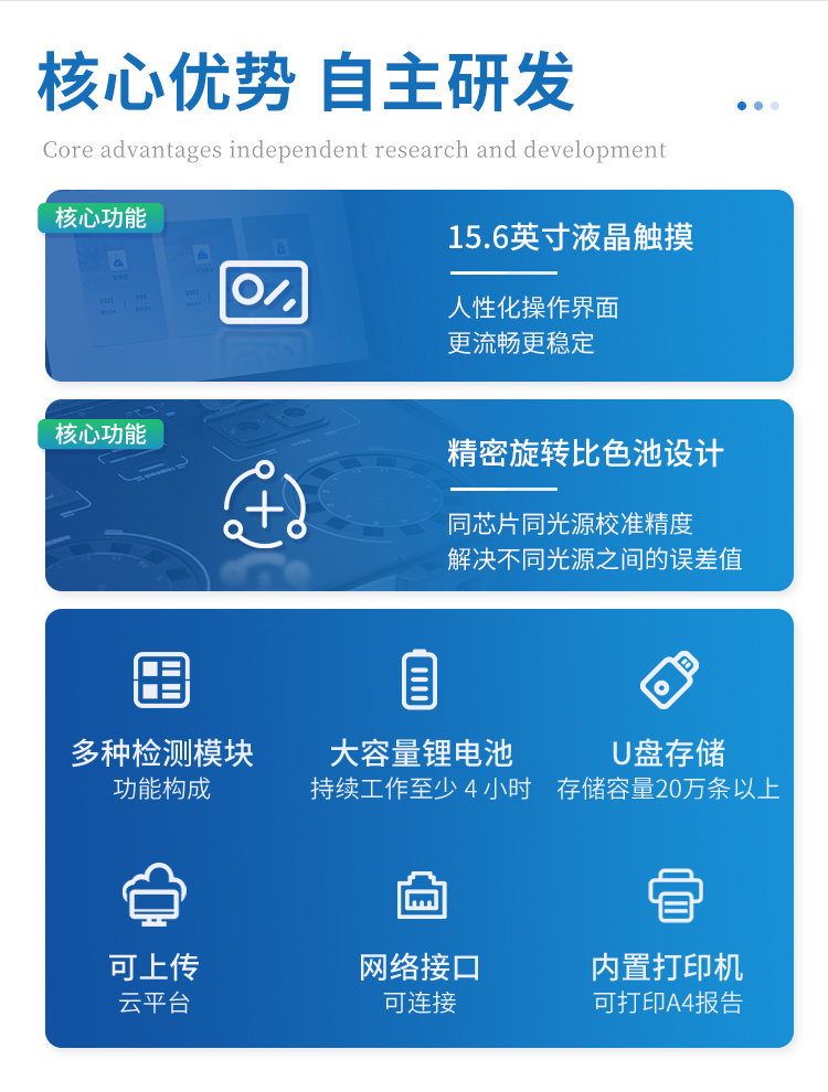 | 儀器采用臺(tái)式一體化系統(tǒng)檢測(cè)技術(shù),將分光光度模塊、膠體金檢測(cè)模塊、新型農(nóng)殘檢測(cè)模塊、數(shù)字化管理模塊、無(wú)線通訊模塊高度集成于一體,支持檢測(cè)200種食品安全檢測(cè)項(xiàng)目,同時(shí)預(yù)留升級(jí)檢測(cè)方法。 | 儀器檢測(cè)模塊標(biāo)準(zhǔn)化、智能化,可隨意自由組合。檢測(cè)箱體內(nèi)置多個(gè)標(biāo)準(zhǔn)檢測(cè)單元,檢測(cè)模塊可以調(diào)整配置。 | 儀器采用全新安卓智能系統(tǒng),主控芯片采用 ARM Cortex-A7,RK3288/4核處理器,10.1寸高清液晶觸摸豎屏,更加**的UI交互界面,運(yùn)轉(zhuǎn)快捷;儀器配備無(wú)線通信模塊: 4G(APN)通訊模塊、Wifi模塊,藍(lán)牙傳輸,同時(shí)具有雙USB接口以及RJ45接口能以多種方式實(shí)現(xiàn)數(shù)據(jù)保存和數(shù)據(jù)傳輸功能。 | 創(chuàng)新檢測(cè)模式★檢測(cè)通道:≥12通道;采用精密旋轉(zhuǎn)比色池設(shè)計(jì),使用同芯片同光源校準(zhǔn)精度,解決不同光源之間的誤差值。1-12通道間誤差0.1%。(專利號(hào):ZL202022821055.2) ★儀器具有自動(dòng)識(shí)別比色皿檢測(cè)功能,即:將樣品比色皿放入儀器后,點(diǎn)擊樣品檢測(cè),儀器自動(dòng)識(shí)別比色皿進(jìn)行通道檢測(cè)。 | 進(jìn)口高精光源:高精度進(jìn)口四波長(zhǎng)冷光源,通道配置 410、520、590、630nm 波長(zhǎng)光源,一個(gè)光源芯片驅(qū)動(dòng)一個(gè)光源,誤差極小,每臺(tái)設(shè)備單獨(dú)**校準(zhǔn)光源,**比對(duì),同時(shí)參照四種不同波段光源全方位覆蓋市面上99%的農(nóng)殘食品項(xiàng)目檢測(cè)。 | 膠體金模塊檢測(cè)方式:★采用COMS實(shí)時(shí)成像技術(shù),可采集多個(gè)畫面,支持2個(gè)金標(biāo)同時(shí)讀卡,通過(guò)不同顏色的灰度變化,一秒精準(zhǔn)得出結(jié)果。 | 智能操作分析系統(tǒng): | ★便捷操作系統(tǒng):設(shè)備檢測(cè)時(shí)可在同一檢測(cè)界面自動(dòng)對(duì)應(yīng)相關(guān)檢測(cè)通道一次性選擇1-12個(gè)樣品名稱,無(wú)須退出界面,節(jié)省操作時(shí)間。(需提供對(duì)應(yīng)證明) | ★數(shù)據(jù)集成系統(tǒng):設(shè)備首頁(yè)自動(dòng)統(tǒng)計(jì)檢測(cè)數(shù)據(jù)包含:周檢測(cè)數(shù)據(jù)、月檢測(cè)數(shù)據(jù),全部檢測(cè)總數(shù)量,均包含檢測(cè)總數(shù),合格數(shù),不合格數(shù),以及相關(guān)柱形分析圖,對(duì)各項(xiàng)檢測(cè)數(shù)據(jù)清晰掌握,無(wú)需電腦查詢,更加快捷直觀。(需提供對(duì)應(yīng)證明文件) | ★項(xiàng)目預(yù)設(shè)系統(tǒng):支持添加單個(gè)及多個(gè)相同或不相同的任務(wù)預(yù)設(shè),一鍵快速調(diào)取,每一個(gè)任務(wù)分別可以設(shè)置不同的樣品、批次、編號(hào)、來(lái)源、備注、抽樣信息、檢測(cè)信息、受檢信息、復(fù)核信息等更多信息。無(wú)縫鏈接平臺(tái)和APP實(shí)時(shí)查看下發(fā)任務(wù)。(需提供對(duì)應(yīng)證明文件) | ★數(shù)據(jù)監(jiān)管系統(tǒng):同步對(duì)接監(jiān)管平臺(tái),數(shù)據(jù)可局域網(wǎng)和互聯(lián)網(wǎng)數(shù)據(jù)上傳,檢測(cè)結(jié)果可選擇直接傳至食品安全監(jiān)管平臺(tái)。集成OSS輸出存儲(chǔ)服務(wù)、區(qū)分設(shè)備定向管理應(yīng)用,進(jìn)行區(qū)域食品安全監(jiān)管及大數(shù)據(jù)分析處理與數(shù)據(jù)統(tǒng)計(jì),檢測(cè)區(qū)域食品安全長(zhǎng)短期動(dòng)態(tài),達(dá)到食品安全問(wèn)題預(yù)估、預(yù)警。(需提供對(duì)應(yīng)食品理化分析系統(tǒng)計(jì)算機(jī)軟件著作權(quán))。 | ★ 自定義打印系統(tǒng):內(nèi)置全新打印系統(tǒng),新創(chuàng)自定義打印方式,可按需靈活設(shè)置開(kāi)啟或關(guān)閉:產(chǎn)品合格證(國(guó)家農(nóng)業(yè)部標(biāo)準(zhǔn)要求),二維碼,抽樣信息、檢測(cè)信息,受檢信息、復(fù)核信息、抽樣日期、檢測(cè)日期等信息的打印。(需提供對(duì)應(yīng)證明) | ★系統(tǒng)遠(yuǎn)程更新功能:可定向分客戶分儀器更新系統(tǒng),按照不同客戶后期實(shí)際需求添加項(xiàng)目,無(wú)需機(jī)器返廠,即可遠(yuǎn)程實(shí)時(shí)升級(jí)全新系統(tǒng),節(jié)省時(shí)間成本及避免運(yùn)輸造成設(shè)備損壞。 | 儀器主機(jī)采用一體化防水、抗壓、防撞擊、防腐蝕箱體設(shè)計(jì),同時(shí)配備交直流供電,可連接車載電源,可選配大容量充電鋰電池,滿足現(xiàn)場(chǎng)野外檢測(cè)需求。 | 安全證書(shū),放心保障:儀器具有中國(guó)計(jì)量科學(xué)研究院校準(zhǔn)證書(shū),**認(rèn)證。 |
