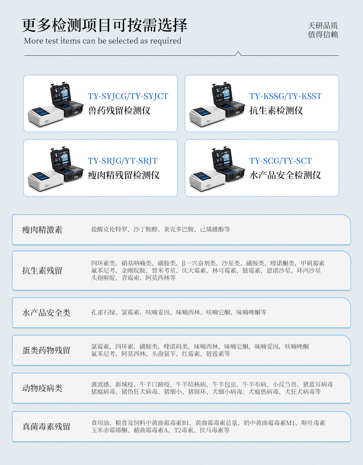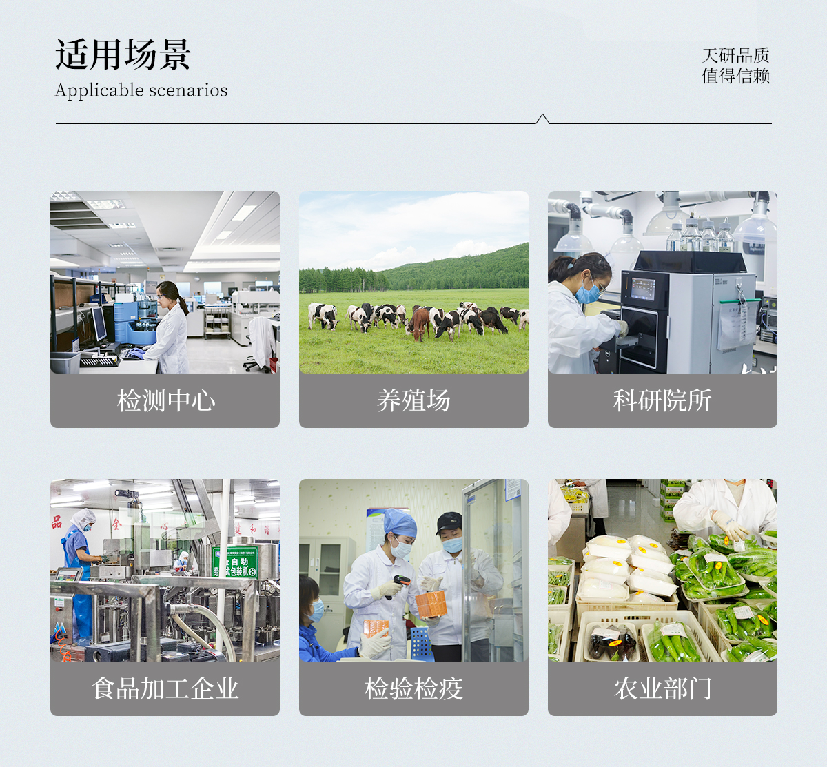 | 食品添加劑:二氧化硫、雙氧水、亞硝酸鹽、硝酸鹽、苯甲酸鈉、山梨酸鉀、糖精鈉、甜蜜素、木耳硫酸鎂等 | 有毒有害物質(zhì):甲醛、吊白塊、硼砂、過氧化苯甲酰、溴酸鉀、羅丹明B、三聚氰胺、蘇丹紅、工業(yè)堿、尿素、明礬等 | 果蔬:農(nóng)藥殘留(酶抑制率法) | 病害肉診斷:組胺、揮發(fā)性鹽基氮; | 重金屬含量:鉛、鎘、鉻、汞、砷、錫、鎳、鋁等; | 食用油脂: 過氧化值、酸價(jià)等 | 瘦肉精激素類(獸藥):鹽酸克倫特羅、沙丁胺醇、萊克多巴胺、己烯雌酚等 | 抗生素殘留類(獸藥):四環(huán)素類、硝基呋喃類、磺胺類、β-興奮劑類、沙星類、磺胺類、喹諾酮類,甲砜霉素,氟苯尼考,金剛烷胺、替米考星、慶大霉素、林可霉素、鏈霉素、恩諾沙星、環(huán)丙沙星、頭孢啦啶、青霉素、阿莫西林等 | 真菌毒素類:食用油、糧食及飼料中黃曲霉毒素B1、黃曲霉毒素總量,奶中黃曲霉毒素M1、嘔吐毒素、玉米赤霉烯酮、赭曲霉毒素A、T2毒素、伏馬毒素等; | 水酒飲品分析:酒中甲醇、乙醇、乳品及牛奶中蛋白質(zhì), | 調(diào)味品成分:食醋的總酸、醬油的總酸、芝麻油純度、谷氨酸鈉、醬油氨基酸態(tài)氮、食鹽中亞鐵氰化鉀、食鹽中碘等 | 食用色素類:紅色色素(胭脂紅、莧菜紅、赤蘚紅、誘惑紅)、黃色色素(檸檬黃、日落黃)、藍(lán)色色素(亮藍(lán))等 | 動(dòng)物疫病類:禽流感、新城疫、牛羊口蹄疫、牛羊結(jié)核病、牛羊包蟲、牛羊布病、小反芻獸、豬藍(lán)耳病毒、豬瘟病毒、豬偽狂犬病毒、豬細(xì)小、豬圓環(huán)、犬細(xì)小病毒、犬瘟熱病毒、犬狂犬病毒等; | 蜂蜜成分:果糖和葡萄糖、蔗糖、淀粉酶、酸度等 | 水產(chǎn)品安全類:孔雀石綠、氯霉素、呋喃妥因、呋喃西林、呋喃它酮、呋喃唑酮等 | 蛋類藥物殘留:氯霉素,四環(huán)素,磺胺類,喹諾酮類,呋喃西林,呋喃它酮,呋喃妥因,呋喃唑酮,氟苯尼考,阿莫西林、頭孢氨芐、紅霉素、鏈霉素等 |