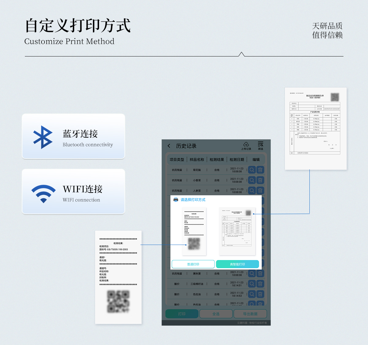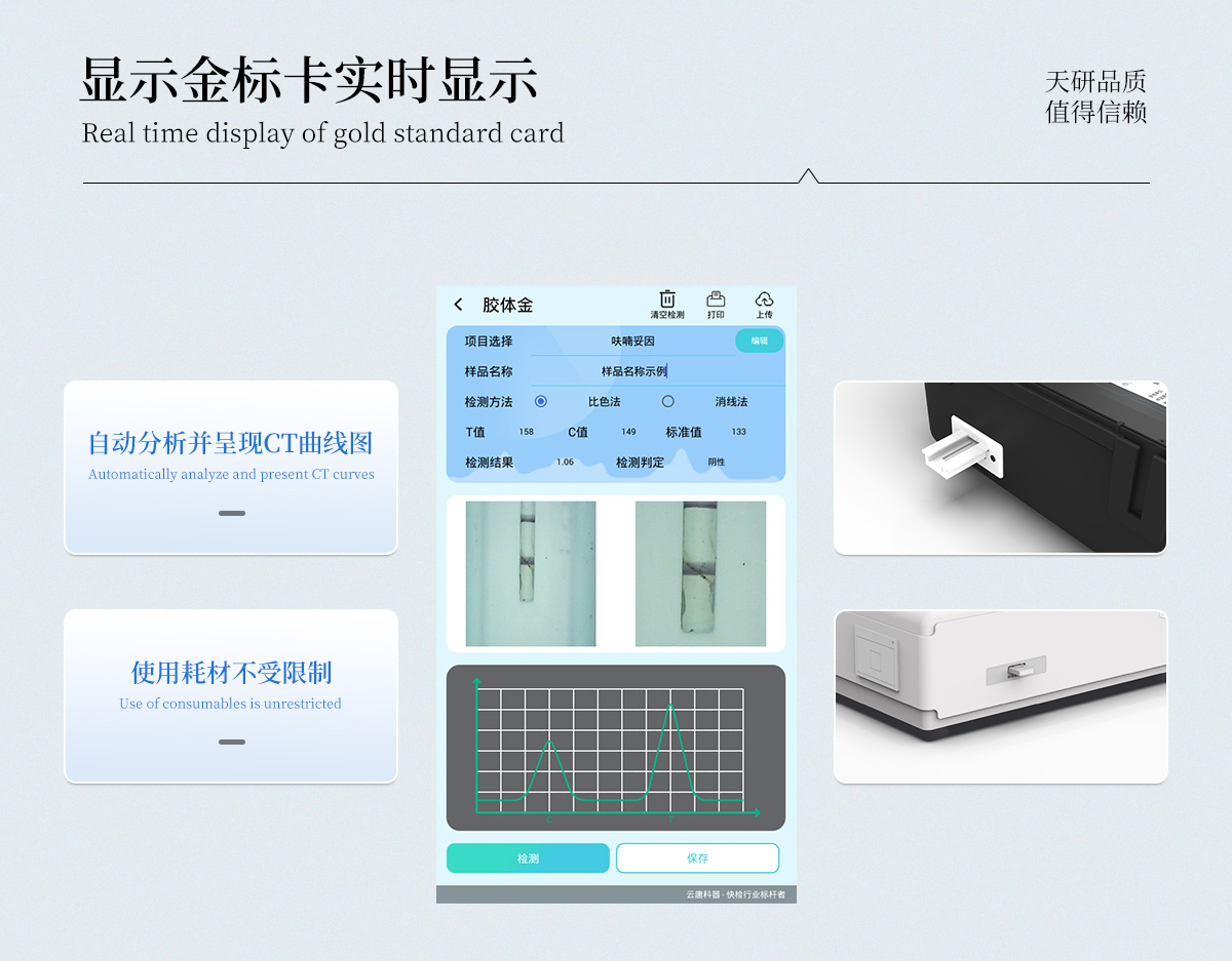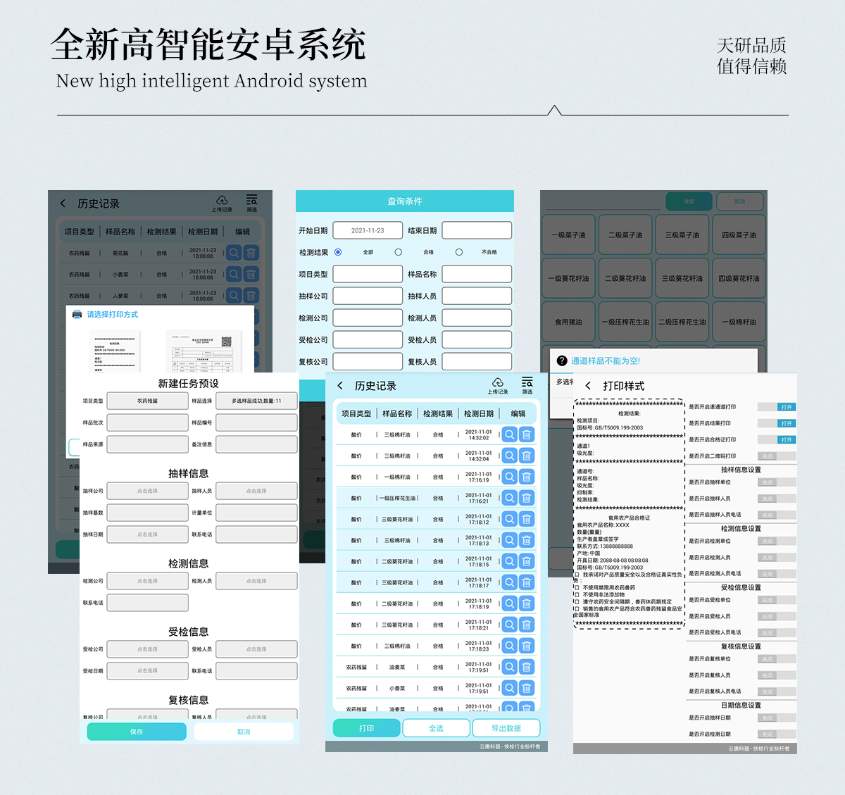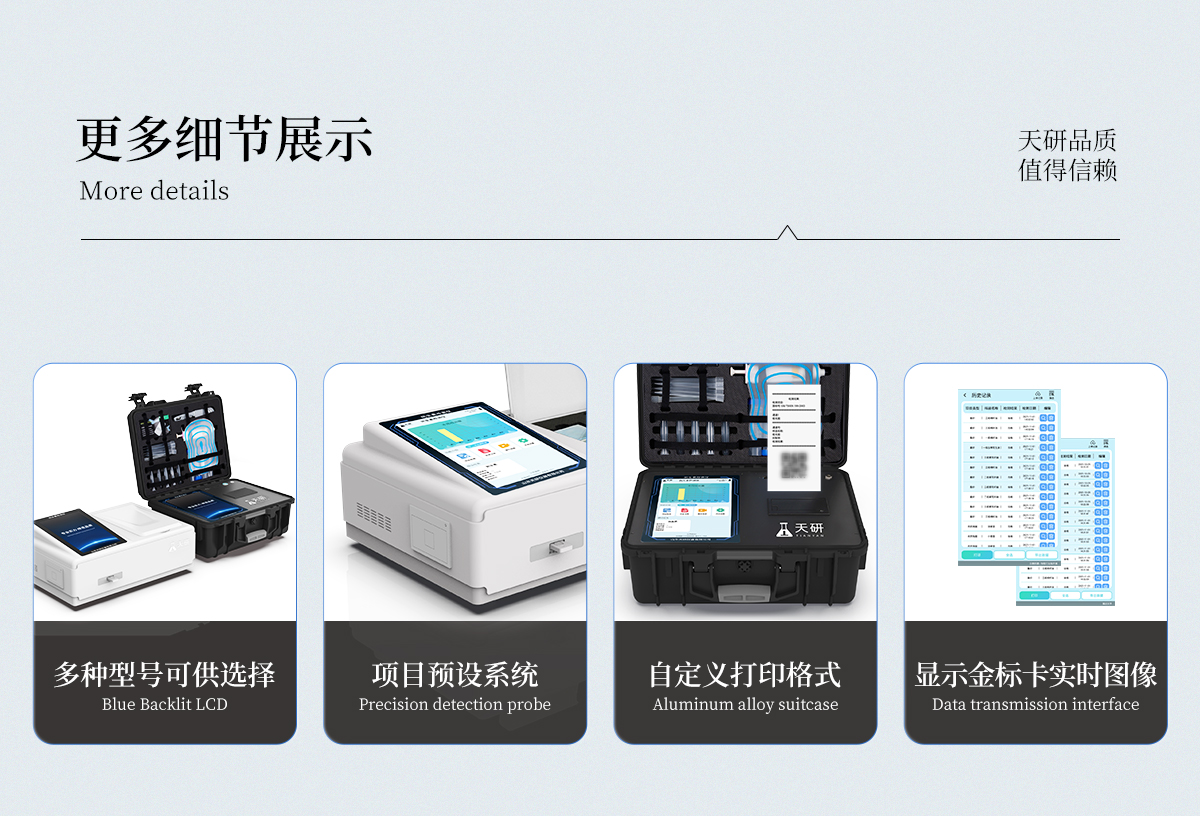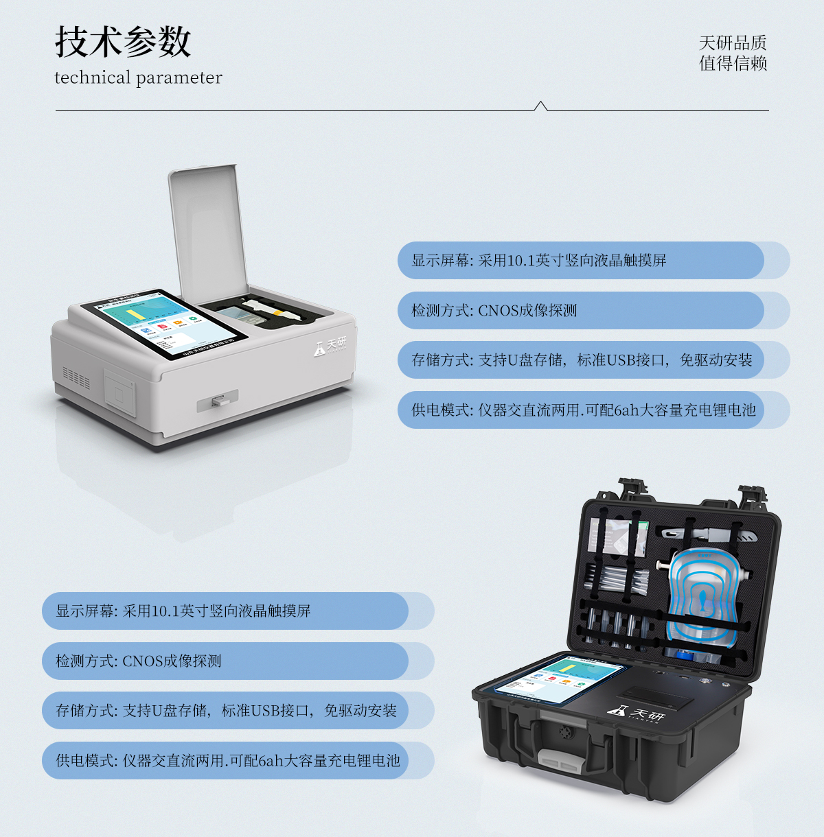 | 儀器采用手提一體化系統(tǒng)檢測(cè)技術(shù),將分光光度模塊、膠體金檢測(cè)模塊、新型農(nóng)殘檢測(cè)模塊、數(shù)字化管理模塊、無線通訊模塊高度集成于一體,支持檢測(cè)200種食品安全檢測(cè)項(xiàng)目,同時(shí)預(yù)留升級(jí)檢測(cè)方法。 | 儀器檢測(cè)模塊標(biāo)準(zhǔn)化、智能化,檢測(cè)項(xiàng)目可隨意自由組合。檢測(cè)箱體內(nèi)置多個(gè)標(biāo)準(zhǔn)檢測(cè)單元,檢測(cè)模塊可以調(diào)整配置。 | 顯示屏幕:儀器采用10.1英寸豎向液晶觸摸屏顯,搭配運(yùn)行安卓智能操作系統(tǒng),主控芯片采用ARM Cortex-A7,RK3288/4核處理器,主頻1.88Ghz,操作方便,性能更強(qiáng)。 | 檢測(cè)通道:≥12通道;采用精密旋轉(zhuǎn)比色池設(shè)計(jì),使用同芯片同光源校準(zhǔn)精度,解決不同光源之間的誤差值,更加準(zhǔn)確**。(1-12通道間誤差0.1%,專利號(hào):ZL202022821055.2) | 儀器光源:高精度進(jìn)口四波長(zhǎng)冷光源,每個(gè)通道均配置 410、520、590、630nm 波長(zhǎng)光源,標(biāo)配**的光路切換裝置,專利光路切換功能可實(shí)現(xiàn)64波長(zhǎng),并且所有檢測(cè)項(xiàng)目可實(shí)現(xiàn)所有通道同時(shí)檢測(cè)。 | 設(shè)備可一鍵校準(zhǔn),自動(dòng)保存校準(zhǔn)數(shù)據(jù),自動(dòng)對(duì)比校驗(yàn),得到精準(zhǔn)光源,采用Android SP存儲(chǔ)數(shù)據(jù),光源數(shù)據(jù)永不丟失,方便每一次使用。 | 通訊接口:配備無線通信模塊、4G(APN)通訊模塊、藍(lán)牙傳輸,同時(shí)具有雙USB接口以及RJ45網(wǎng)線接口,可以多方式實(shí)現(xiàn)數(shù)據(jù)保存及數(shù)據(jù)傳輸。 | 存儲(chǔ)方式:支持U盤存儲(chǔ),標(biāo)準(zhǔn)USB接口,免驅(qū)動(dòng)安裝。檢測(cè)結(jié)果存儲(chǔ)容量20萬條以上,可生成Excel表格進(jìn)行拷貝,并具有登錄保護(hù)功能。 | 智能化操作系統(tǒng):: ★操作系統(tǒng):儀器可在同一檢測(cè)界面自動(dòng)對(duì)應(yīng)相關(guān)檢測(cè)通道,一次性選擇1-12個(gè)樣品名稱,無需退出界面,節(jié)省操作時(shí)間。并可以對(duì)每個(gè)通道屬性和樣品信息單獨(dú)進(jìn)行編輯,例如送檢單位、人員,檢測(cè)人員等,打印時(shí)勾選打印顯示。 | ★數(shù)據(jù)集成系統(tǒng):設(shè)備首頁(yè)自動(dòng)匯總分析檢測(cè)數(shù)據(jù),包含:周檢測(cè)數(shù)據(jù)、月檢測(cè)數(shù)據(jù),全部檢測(cè)總數(shù)量,均包含檢測(cè)總數(shù),合格數(shù),不合格數(shù),以及相關(guān)柱形分析圖,各項(xiàng)檢測(cè)數(shù)據(jù)一目了然,無需電腦查詢,更加快捷直觀。 | ★數(shù)據(jù)庫(kù)系統(tǒng):十幾項(xiàng)數(shù)據(jù)庫(kù)分類管理儀器:包含項(xiàng)目類型、項(xiàng)目數(shù)據(jù)、檢測(cè)數(shù)據(jù)、歷史記錄、國(guó)標(biāo)信息、曲線信息、采樣信息、檢測(cè)信息、受檢信息、復(fù)核信息、圖表信息、光源校準(zhǔn)信息、打印樣式信息、樣品庫(kù)信息等等,數(shù)據(jù)庫(kù)之間互相協(xié)調(diào)聯(lián)動(dòng)保證數(shù)據(jù)的真實(shí)完整性。同時(shí)產(chǎn)品數(shù)據(jù)庫(kù)以及歷史檢測(cè)記錄支持一鍵檢索功能。 | ★限量規(guī)判系統(tǒng):具有限量查詢、添加物質(zhì)合規(guī)判定系統(tǒng)。檢測(cè)出結(jié)果后,系統(tǒng)自動(dòng)調(diào)用系統(tǒng)數(shù)據(jù)庫(kù)中相關(guān)國(guó)標(biāo)進(jìn)行比對(duì)判定,客觀顯示判定結(jié)果是否合格 | ★項(xiàng)目預(yù)設(shè)系統(tǒng):儀器具有任務(wù)預(yù)設(shè)模塊,一鍵提前預(yù)設(shè),給出方便快捷的新檢測(cè)方案,每一個(gè)任務(wù)分別可以設(shè)置不同的樣品、批次、編號(hào)、來源、備注、抽樣信息、檢測(cè)信息、受檢信息、復(fù)核信息等更多信息。樣品送檢時(shí)一鍵調(diào)取保存信息,并可多次調(diào)取,大大提高檢測(cè)效率。 | ★數(shù)據(jù)監(jiān)管系統(tǒng):同步對(duì)接監(jiān)管平臺(tái),數(shù)據(jù)可局域網(wǎng)和互聯(lián)網(wǎng)數(shù)據(jù)上傳,檢測(cè)結(jié)果可選擇直接傳至食品安全監(jiān)管平臺(tái)。進(jìn)行區(qū)域食品安全監(jiān)管及大數(shù)據(jù)分析處理與數(shù)據(jù)統(tǒng)計(jì),檢測(cè)區(qū)域食品安全長(zhǎng)短期動(dòng)態(tài),達(dá)到食品安全問題預(yù)估、預(yù)警。 | ★打印系統(tǒng):內(nèi)置全新打印機(jī),新創(chuàng)自定義打印方式,可按需靈活勾選控制:產(chǎn)品合格證(國(guó)家農(nóng)業(yè)部標(biāo)準(zhǔn)要求),二維碼,抽樣信息、檢測(cè)信息,受檢信息、復(fù)核信息、抽樣日期、檢測(cè)日期等信息的打印。 | 供電模式:儀器交直流兩用,直流12V供電,可連接車載電源,可配6ah大容量充電鋰電池,電量可實(shí)時(shí)顯示,方便戶外流動(dòng)測(cè)試。 | 膠體金檢測(cè)模塊:采用雙通道CMOS成像處理技術(shù)及膠體金免疫層析技術(shù),可同時(shí)讀取雙膠體金卡數(shù)據(jù),自動(dòng)采集、處理分析,將檢測(cè)結(jié)果顯示,并可根據(jù)參考限值自動(dòng)判斷檢測(cè)結(jié)果,可檢測(cè)常見的獸藥殘留、生物毒素、抗生素、違禁添加物等。 | ★探測(cè)技術(shù):CMOS成像探測(cè); | ★檢測(cè)通道:1個(gè)通道; | ★檢測(cè)方式:消線法和比色法; | ★顯示模式:陰性或陽(yáng)性; |