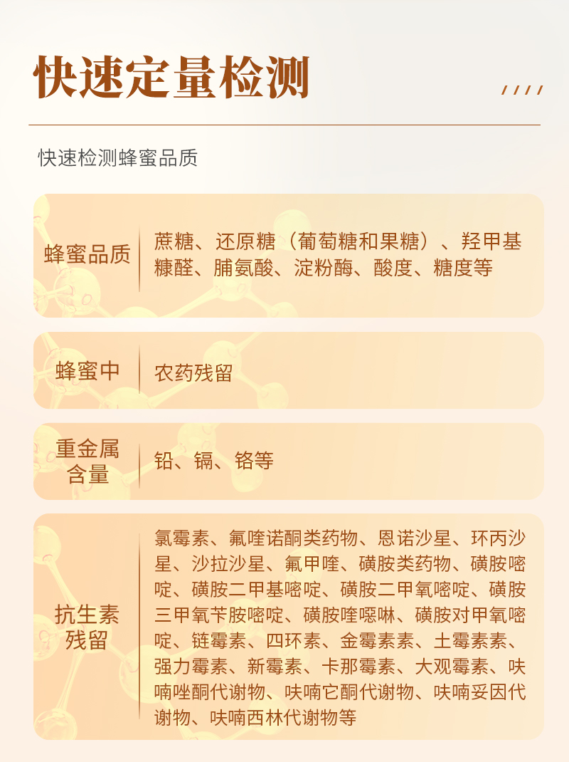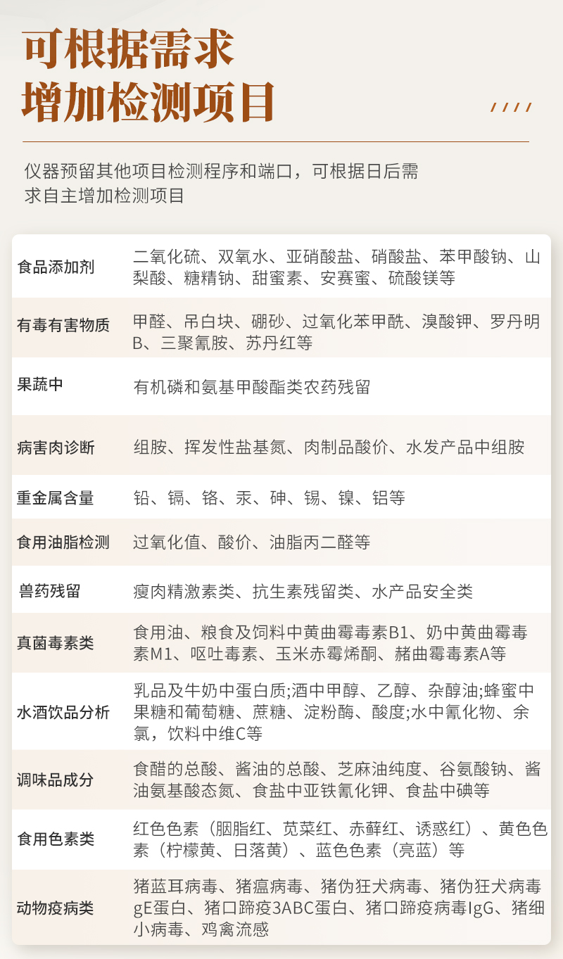 | 食品添加劑:二氧化硫、雙氧水、亞硝酸鹽、硝酸鹽、苯甲酸鈉、山梨酸鉀、糖精鈉、甜蜜素、木耳硫酸鎂等 | 有毒有害物質(zhì):甲醛、吊白塊、硼砂、過(guò)氧化苯甲酰、溴酸鉀、羅丹明B、三聚氰胺、蘇丹紅、工業(yè)堿、尿素、明礬等 | 果蔬:農(nóng)藥殘留(酶抑制率法) | 病害肉診斷:組胺、揮發(fā)性鹽基氮; | 重金屬含量:鉛、鎘、鉻、汞、砷、錫、鎳、鋁等; | 食用油脂: 過(guò)氧化值、酸價(jià)等 | 瘦肉精激素類(lèi)(獸藥):鹽酸克倫特羅、沙丁胺醇、萊克多巴胺、己烯雌酚等 | 抗生素殘留類(lèi)(獸藥):四環(huán)素類(lèi)、硝基呋喃類(lèi)、磺胺類(lèi)、β-興奮劑類(lèi)、沙星類(lèi)、磺胺類(lèi)、喹諾酮類(lèi),甲砜霉素,氟苯尼考,金剛烷胺、替米考星、慶大霉素、林可霉素、鏈霉素、恩諾沙星、環(huán)丙沙星、頭孢啦啶、青霉素、阿莫西林等 | 真菌毒素類(lèi):食用油、糧食及飼料中黃曲霉毒素B1、黃曲霉毒素總量,奶中黃曲霉毒素M1、嘔吐毒素、玉米赤霉烯酮、赭曲霉毒素A、T2毒素、伏馬毒素等; | 水酒飲品分析:酒中甲醇、乙醇、乳品及牛奶中蛋白質(zhì), | 調(diào)味品成分:食醋的總酸、醬油的總酸、芝麻油純度、谷氨酸鈉、醬油氨基酸態(tài)氮、食鹽中亞鐵氰化鉀、食鹽中碘等 | 食用色素類(lèi):紅色色素(胭脂紅、莧菜紅、赤蘚紅、誘惑紅)、黃色色素(檸檬黃、日落黃)、藍(lán)色色素(亮藍(lán))等 | 動(dòng)物疫病類(lèi):禽流感、新城疫、牛羊口蹄疫、牛羊結(jié)核病、牛羊包蟲(chóng)、牛羊布病、小反芻獸、豬藍(lán)耳病毒、豬瘟病毒、豬偽狂犬病毒、豬細(xì)小、豬圓環(huán)、犬細(xì)小病毒、犬瘟熱病毒、犬狂犬病毒等; | 蜂蜜成分:果糖和葡萄糖、蔗糖、淀粉酶、酸度等 | 水產(chǎn)品安全類(lèi):孔雀石綠、氯霉素、呋喃妥因、呋喃西林、呋喃它酮、呋喃唑酮等 | 蛋類(lèi)藥物殘留:氯霉素,四環(huán)素,磺胺類(lèi),喹諾酮類(lèi),呋喃西林,呋喃它酮,呋喃妥因,呋喃唑酮,氟苯尼考,阿莫西林、頭孢氨芐、紅霉素、鏈霉素等 |