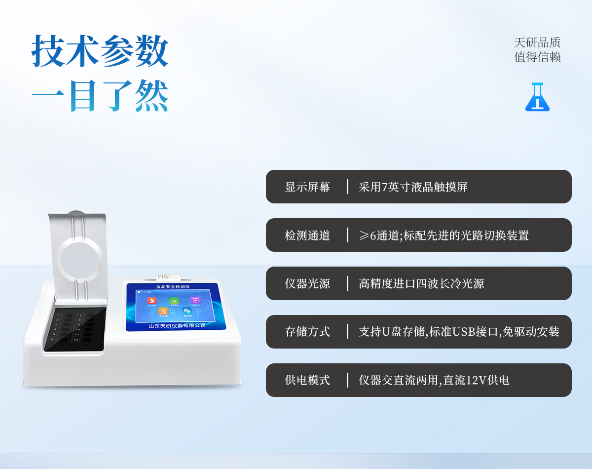 產(chǎn)品介紹: 多功能食品安全檢測儀可快速檢測200多項(xiàng)目,包含非食用化學(xué)物質(zhì)、濫用食品添加劑、農(nóng)藥殘留、獸藥殘留、重金屬、病害肉、營養(yǎng)強(qiáng)化劑、抗生素類殘留、激素類殘留、真菌毒素類殘留、化學(xué)類殘留等現(xiàn)場的定性定量檢測。該多功能食品安全檢測儀為集成化食品安全快速檢測分析設(shè)備,廣泛應(yīng)用于市場
