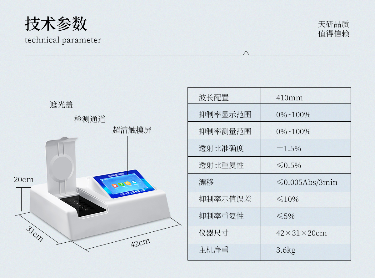 | 410nm | 0%~100% | 0%~100% | ±1.5% | ≤0.5% | ≤0.005Abs/3min | ≤10% | ≤5% | 42×31×20cm | 3.6kg |
