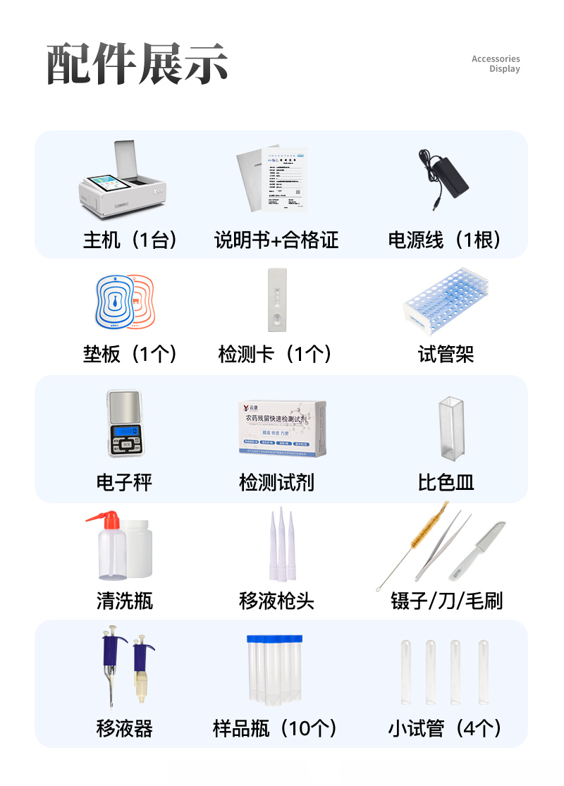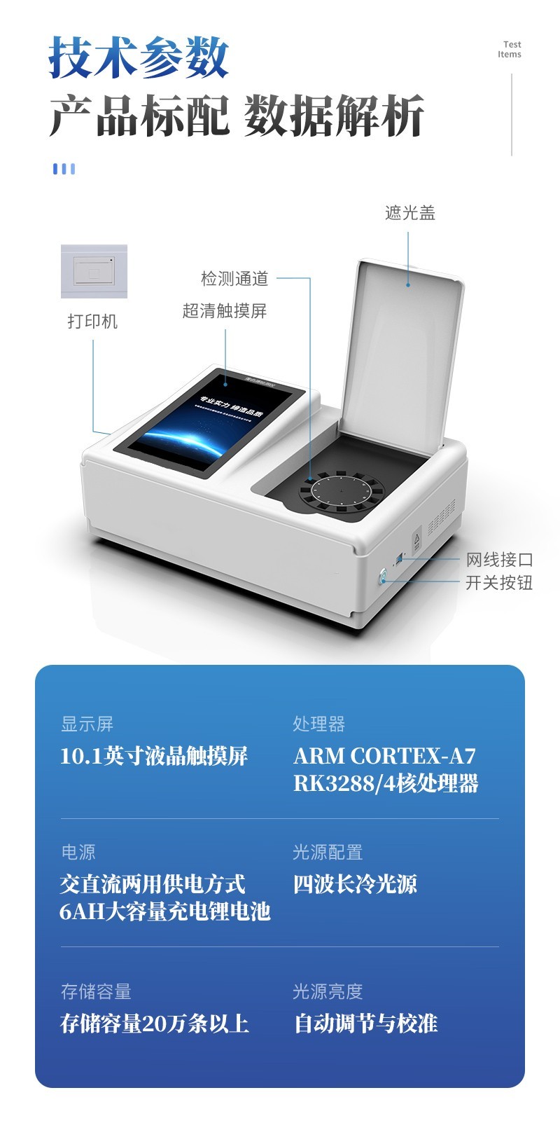 | 儀器采用臺式一體化系統(tǒng)檢測技術(shù),將分光光度模塊、新型農(nóng)殘檢測模塊、數(shù)字化管理模塊、無線通訊模塊高度集成于一體,支持檢測200種食品安全檢測項目,同時預(yù)留升級檢測方法。 | 儀器檢測模塊標準化、智能化,可隨意自由組合。檢測箱體內(nèi)置多個標準檢測單元,檢測模塊可以調(diào)整配置。 | 儀器采用全新安卓智能系統(tǒng),主控芯片采用 ARM Cortex-A7,RK3288/4核處理器,10.1寸高清液晶觸摸豎屏,更加**的UI交互界面,運轉(zhuǎn)快捷;儀器配備無線通信模塊: 4G(APN)通訊模塊、Wifi模塊,藍牙傳輸,同時具有雙USB接口以及RJ45接口能以多種方式實現(xiàn)數(shù)據(jù)保存和數(shù)據(jù)傳輸功能。 | 創(chuàng)新檢測模式: | ★檢測通道:≥12通道;采用精密旋轉(zhuǎn)比色池設(shè)計,使用同芯片同光源校準精度,解決不同光源之間的誤差值。1-12通道間誤差0.1%。(專利號:ZL202022821055.2) | ★儀器具有自動識別比色皿檢測功能,即:將樣品比色皿放入儀器后,點擊樣品檢測,儀器自動識別比色皿進行通道檢測。 | 進口高精光源: | 高精度進口四波長冷光源,通道配置 410、520、590、630nm 波長光源,一個光源芯片驅(qū)動一個光源,誤差極小,每臺設(shè)備單獨**校準光源,**比對,同時參照四種不同波段光源全方位覆蓋市面上99%的農(nóng)殘食品項目檢測。 | 智能化操作系統(tǒng): | 便捷操作系統(tǒng):設(shè)備檢測時可在同一檢測界面自動對應(yīng)相關(guān)檢測通道一次性選擇1-12個樣品名稱,無須退出界面,節(jié)省操作時間。 | 數(shù)據(jù)集成系統(tǒng):設(shè)備首頁自動統(tǒng)計檢測數(shù)據(jù)包含:周檢測數(shù)據(jù)、月檢測數(shù)據(jù),全部檢測總數(shù)量,均包含檢測總數(shù),合格數(shù),不合格數(shù),以及相關(guān)柱形分析圖,對各項檢測數(shù)據(jù)清晰掌握,無需電腦查詢,更加快捷直觀。 | 項目預(yù)設(shè)系統(tǒng):支持添加單個及多個相同或不相同的任務(wù)預(yù)設(shè),一鍵快速調(diào)取,每一個任務(wù)分別可以設(shè)置不同的樣品、批次、編號、來源、備注、抽樣信息、檢測信息、受檢信息、復(fù)核信息等更多信息。無縫鏈接平臺和APP實時查看下發(fā)任務(wù)。 | 數(shù)據(jù)監(jiān)管系統(tǒng):同步對接監(jiān)管平臺,數(shù)據(jù)可局域網(wǎng)和互聯(lián)網(wǎng)數(shù)據(jù)上傳,檢測結(jié)果可選擇直接傳至食品安全監(jiān)管平臺。集成OSS輸出存儲服務(wù)、區(qū)分設(shè)備定向管理應(yīng)用,進行區(qū)域食品安全監(jiān)管及大數(shù)據(jù)分析處理與數(shù)據(jù)統(tǒng)計,檢測區(qū)域食品安全長短期動態(tài),達到食品安全問題預(yù)估、預(yù)警。 | 自定義打印系統(tǒng):內(nèi)置全新打印系統(tǒng),新創(chuàng)自定義打印方式,可按需靈活設(shè)置開啟或關(guān)閉:產(chǎn)品合格證(國家農(nóng)業(yè)部標準要求),二維碼,抽樣信息、檢測信息,受檢信息、復(fù)核信息、抽樣日期、檢測日期等信息的打印。 | 系統(tǒng)遠程更新功能:可定向分客戶分儀器更新系統(tǒng),按照不同客戶后期實際需求添加項目,無需機器返廠,即可遠程實時升級全新系統(tǒng),節(jié)省時間成本及避免運輸造成設(shè)備損壞。 | 儀器主機采用一體化防水、抗壓、防撞擊、防腐蝕箱體設(shè)計,同時配備交直流供電,可連接車載電源,可選配大容量充電鋰電池,滿足現(xiàn)場野外檢測需求。 | 安全證書,放心保障:儀器具有中國計量科學(xué)研究院校準證書,**認證。 |