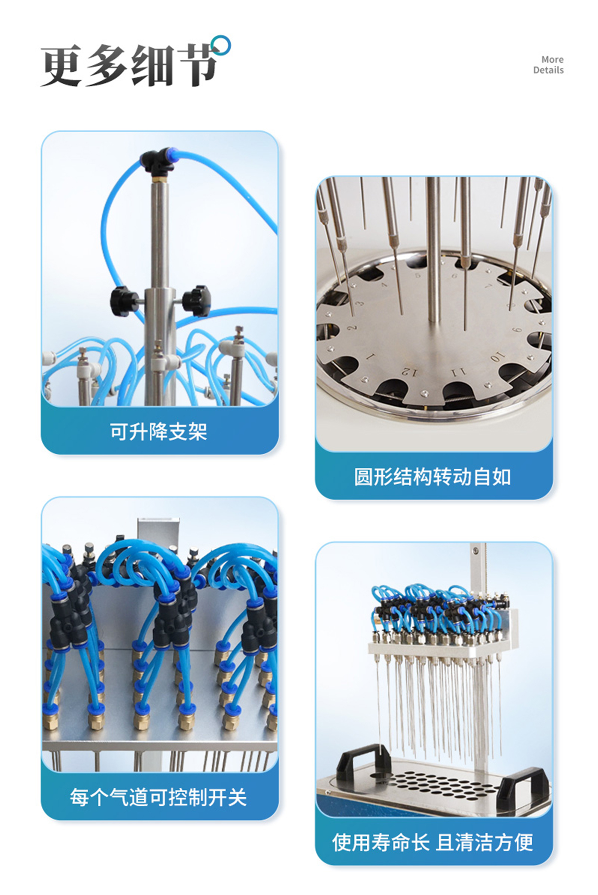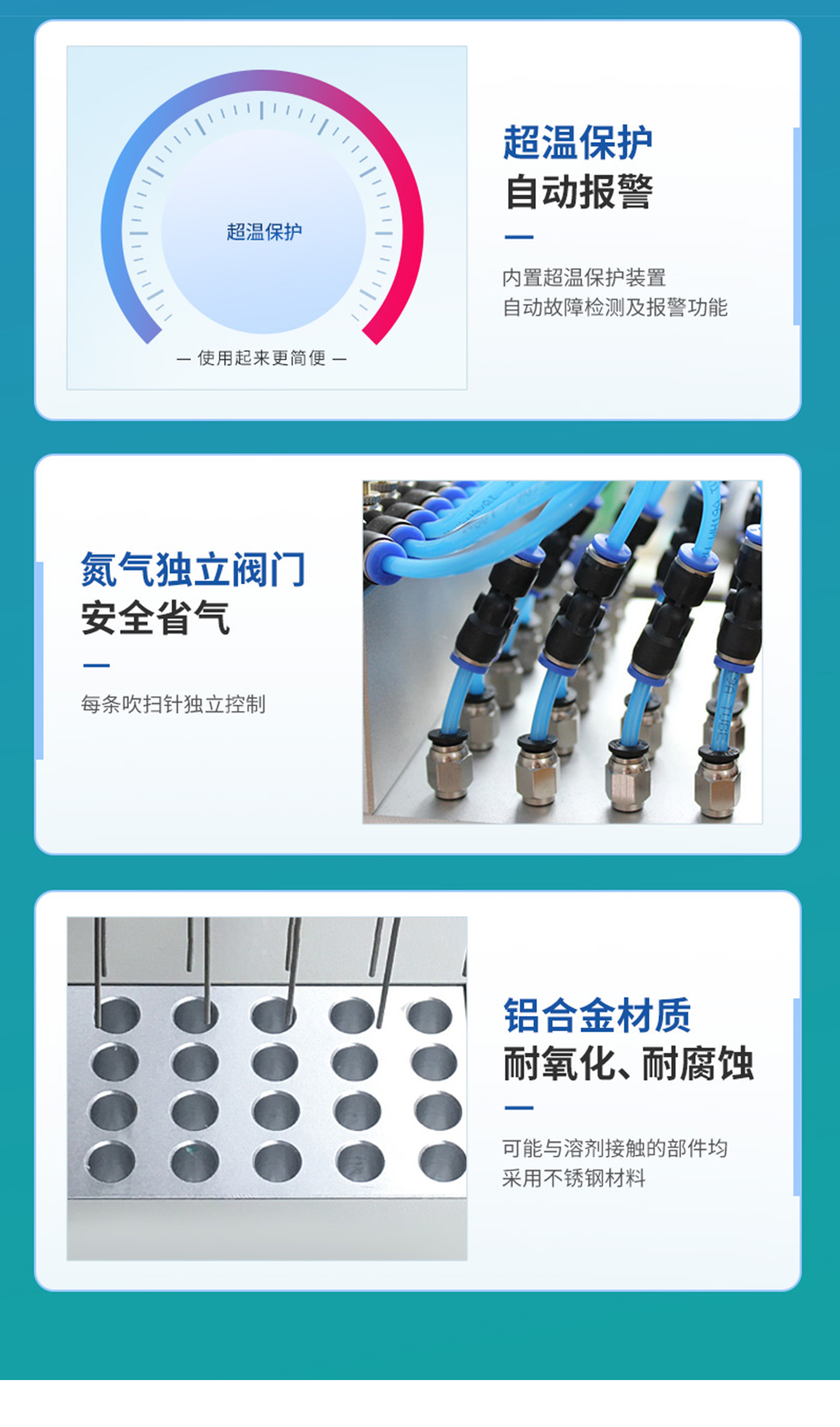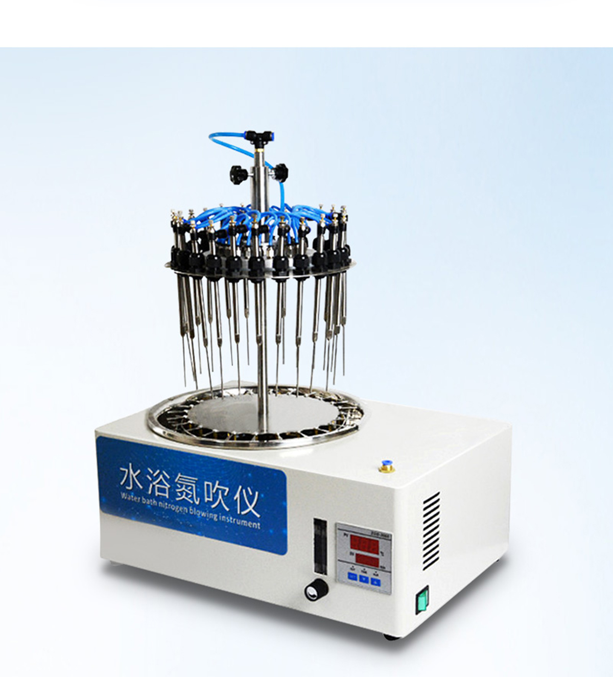 | 分配室上各氣針通道可組合使用或單獨(dú)使用,每一路氣針均可單獨(dú)開關(guān)。分配室的高度可視需要調(diào)節(jié)。 | 每一路氣體流量可單獨(dú)進(jìn)行調(diào)節(jié),克服了不可調(diào)氮吹儀各氣路氣流量大小不一的弱點(diǎn)。 | 數(shù)字溫控器,雙數(shù)字顯示. | 可能與溶劑接觸的部件均采用不銹鋼材料、合金鋁并表面進(jìn)行塑料噴涂,使用壽命長且清潔方便。 | 整機(jī)可放入通風(fēng)櫥中使用。 | 一般標(biāo)配的加熱塊規(guī)格為孔徑∮16mm。 |