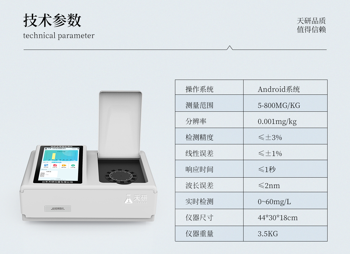 | 1、智能**且方便 | ①智能芯片:主控芯片采用ARM Cortex-A7,RK3288/4核處理器,搭配安卓智能操作系統(tǒng),集實驗操作,分析結(jié)果,打印報告等功能于一體,使用方便,性能更強。 | ②大屏顯示:采用10.1英寸液晶觸摸屏,單機(jī)即可操作,無需連接外部顯示或控制器。 | ③多樣同檢:儀器具有12個檢測通道,可同時一次性檢測11個樣品,效率更高。 | ④工作預(yù)設(shè):具有任務(wù)預(yù)設(shè)模塊,一鍵提前預(yù)設(shè)樣品所有信息內(nèi)容。來樣時可直接檢測,同時可多次調(diào)取。 | ⑤數(shù)據(jù)分析:設(shè)備首頁自動匯總分析數(shù)據(jù),并繪制柱形分析圖,各項檢測數(shù)據(jù)一目了然,快捷直觀。 | ⑥高度集成:模塊高度集合,將分光光度模塊、數(shù)字化管理模塊、無線通訊模塊集成于一體??蓪z測結(jié)果進(jìn)行分析,直接上傳至數(shù)據(jù)平臺,實現(xiàn)數(shù)據(jù)共享,方便后期進(jìn)行數(shù)據(jù)分析與統(tǒng)計。 | ⑦遠(yuǎn)程升級:儀器具備遠(yuǎn)程升級功能,可遠(yuǎn)程升級程序,無需返廠,并可持續(xù)性免費更新系統(tǒng)版本,降低成本及運輸損耗風(fēng)險。 | 2、檢測精準(zhǔn)且直觀 | ①專利技術(shù):精密旋轉(zhuǎn)比色池,使用同芯片同光源校準(zhǔn)精度,解決不同光源之間存在波長誤差的問題,更加準(zhǔn)確**。 | ②結(jié)果直觀:儀器自動對檢測結(jié)果與國標(biāo)限量值進(jìn)行對比,自動判定結(jié)果是否合格,結(jié)果更直觀。 | 3、功能強大且實用 | ①存儲功能:設(shè)備可以存儲數(shù)據(jù)100000組,可在屏幕上直觀查看歷史數(shù)據(jù),可導(dǎo)出數(shù)據(jù)。 | ②打印功能:設(shè)備自帶打印功能,可對樣品信息及檢測結(jié)果無限次隨意打印。 | ③全新方式:新創(chuàng)自定義打印方式,可按需靈活勾選控制:二維碼,抽樣信息、檢測信息,受檢信息、復(fù)核信息、抽樣日期、檢測日期等信息的打印 | ④多重編輯:樣品信息可多重編輯,可以對每個通道屬性和樣品信息單獨進(jìn)行編輯,例如樣品信息、抽樣信息、檢測信息,受檢信息、復(fù)核信息、抽樣日期、檢測日期等信息等。 | ⑤雙語設(shè)計:全中文/英文操作菜單,簡單實用,適用于不同用戶的需求。 |