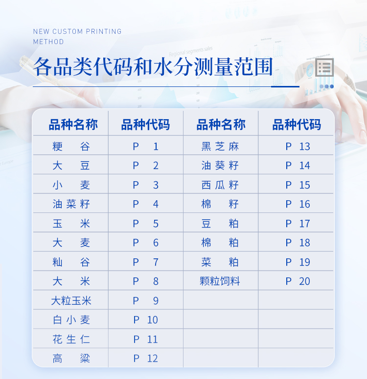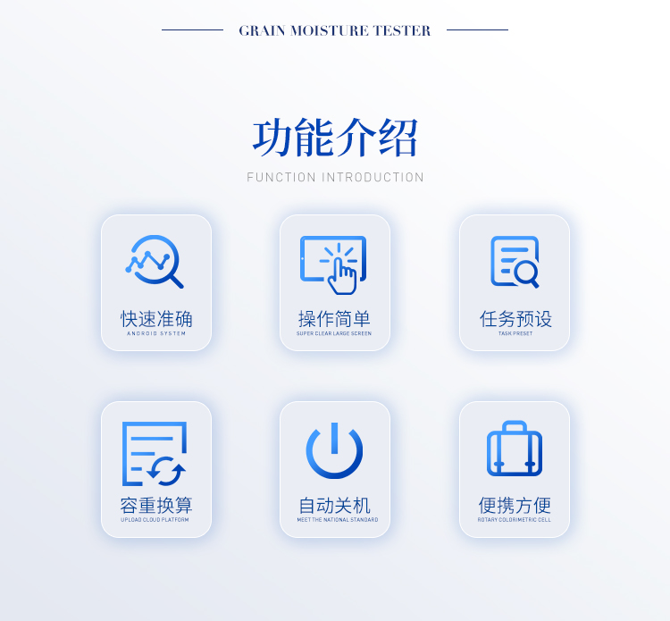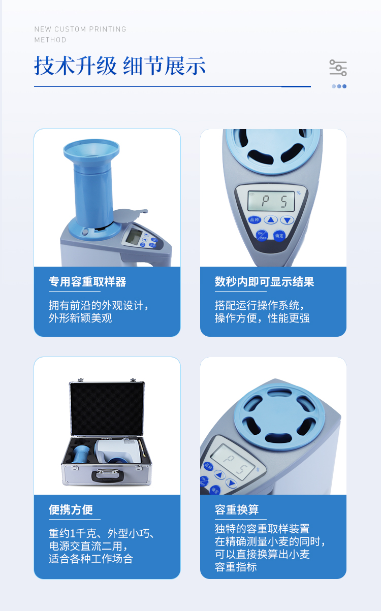容重?fù)Q算:獨(dú)特的專利容重取樣裝置在**測(cè)量小麥的同時(shí),可以直接換算出小麥容重指標(biāo)。