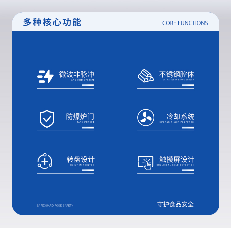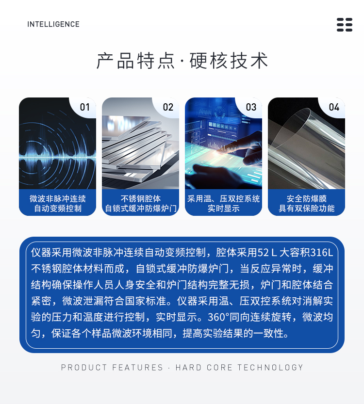儀器采用微波非脈沖連續(xù)自動(dòng)變頻控制,延長(zhǎng)了儀器的使用壽命和電磁波的均勻性,腔體采用52L大容積316L不銹鋼腔體材料制成,自鎖式緩沖防爆爐門,當(dāng)反應(yīng)異常時(shí),緩沖結(jié)構(gòu)確保操作人員人身安全和爐門結(jié)構(gòu)完整無損,爐門和腔體結(jié)合緊密,微波泄漏符合國(guó)家標(biāo)準(zhǔn)。儀器采用溫、壓雙控系統(tǒng)對(duì)消解實(shí)驗(yàn)的壓力和溫度進(jìn)行控制,實(shí)時(shí)顯示。360°同向連續(xù)旋轉(zhuǎn),微波均勻,確定各個(gè)樣品微波環(huán)境相同,提高實(shí)驗(yàn)結(jié)果的一致性。當(dāng)罐內(nèi)的壓力超過設(shè)定的保護(hù)值時(shí),微波會(huì)自動(dòng)停止加熱。安全防爆膜具有雙保險(xiǎn)功能,當(dāng)罐內(nèi)的壓力超過防爆膜所能承受的壓力時(shí),防爆膜先行破裂,氣體瀉出,防止罐體受損和對(duì)人體的傷害。