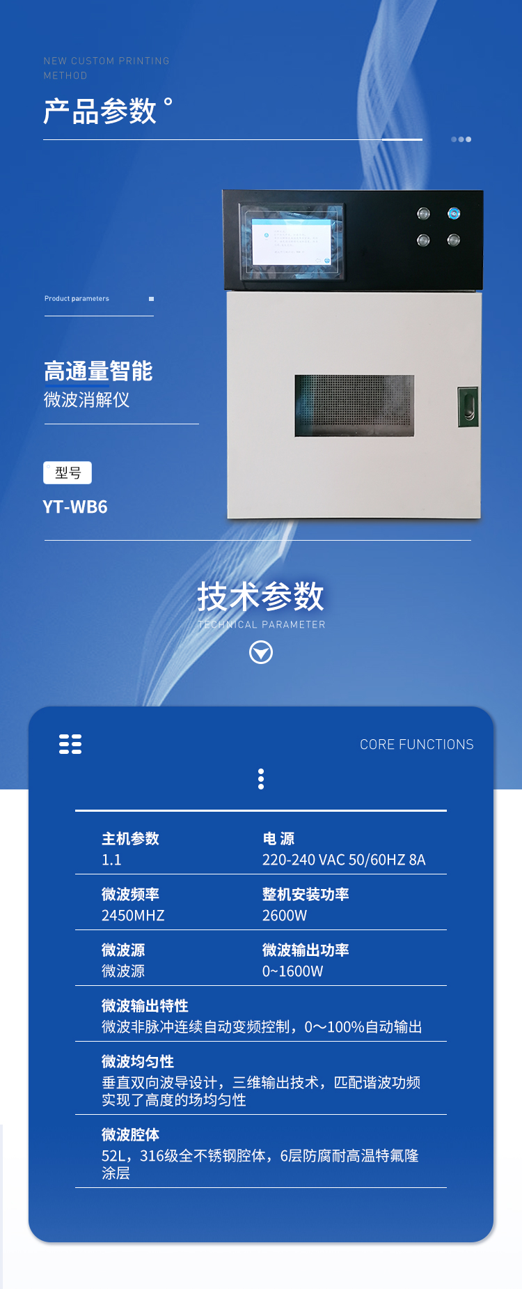 產(chǎn)品說明:TY-WB20高通量智能微波消解儀為樣品提供了快速,安全,自動(dòng)化的解決方案,在高壓條件下加快樣品消解反應(yīng)的速度,廣泛應(yīng)用于食品、環(huán)境保護(hù)、疾病控制、質(zhì)量監(jiān)督、商品檢驗(yàn)、科研院所等領(lǐng)域。產(chǎn)品特點(diǎn):儀器采用微波非脈沖連續(xù)自動(dòng)變頻控制,延長(zhǎng)了儀器的使用壽命和電磁波的均勻性,腔體采用52L大容積316L不銹鋼腔