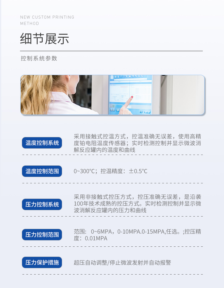 | (1)溫度控制系統(tǒng):采用接觸式控溫方式,控溫準(zhǔn)確無誤差,使用高精度鉑電阻溫度傳感器;實(shí)時(shí)檢測(cè)控制并顯示微波消解反應(yīng)罐內(nèi)的溫度和曲線; | (2)溫度控制范圍:0~300℃;控溫精度:±0.5℃; | (3)控溫能力:速率升溫功能。 | (4)壓力控制系統(tǒng):采用非接觸式控壓方式,控壓準(zhǔn)確無誤差,是沿襲100年技術(shù)成熟的控壓方式。實(shí)時(shí)檢測(cè)控制并顯示微波消解反應(yīng)罐內(nèi)的壓力和曲線; | (5)壓力控制范圍:范圍: 0~6MPa,0-10MPa.0-15MPa,任選。;控壓精度:0.01MPa; | (6)壓力保護(hù):超壓自動(dòng)調(diào)整/停止微波發(fā)射并自動(dòng)報(bào)警; |