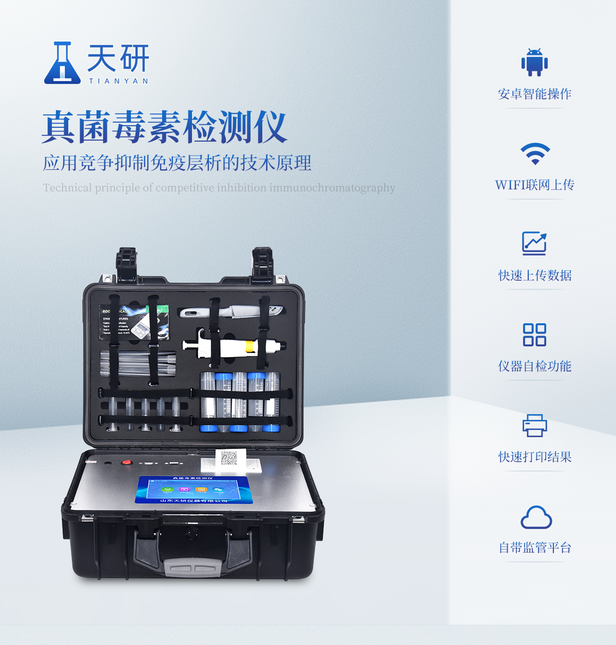 | 用途:可用于糧食谷物及其制品、飼料、植物油中真菌毒素快速定量測(cè)定; | 檢測(cè)方法:采用發(fā)光定量免疫層析技術(shù),激光激發(fā),掃描方式收集發(fā)光熒光信號(hào)。 | 定量參數(shù)設(shè)定:RFID芯片記錄檢測(cè)目標(biāo)的標(biāo)準(zhǔn)曲線,根據(jù)不同樣本類型配備多參數(shù)卡; | 識(shí)別功能:試劑插卡后儀器自動(dòng)識(shí)別檢測(cè)項(xiàng)目; | 靈敏性和特異性:不受外界的背景干擾, 檢測(cè)限為0.4-4500ug/kg;對(duì)其它毒素?zé)o非特異反應(yīng); | 穩(wěn)定性:無淬滅和光漂白現(xiàn)象; | 檢測(cè)時(shí)間快,實(shí)時(shí)顯示檢測(cè)曲線 | 無需孵育器,室溫(15-30℃)下進(jìn)行測(cè)試 | 數(shù)據(jù)獲取和處理:檢測(cè)結(jié)果自動(dòng)獲?。o需目測(cè)),可實(shí)時(shí)打印檢測(cè)報(bào)告;數(shù)據(jù)可儲(chǔ)存,可導(dǎo)出。 | 儀器可靠:有開機(jī)系統(tǒng)自檢功能;儀器配有質(zhì)控卡,確保檢測(cè)系統(tǒng)自身的準(zhǔn)確性; | 檢測(cè)數(shù)據(jù)精準(zhǔn)可靠:HPLC/LC-MS結(jié)果接近 | 檢測(cè)儀器獲得國家認(rèn)證 | 聯(lián)網(wǎng):網(wǎng)絡(luò)接口 | 升級(jí):可以通過U盤進(jìn)行軟件升級(jí) | 存儲(chǔ)空間:≥32G,最大擴(kuò)展至64G | 工作功率:40W | 操作系統(tǒng):windows 7 | 顯示屏:可觸摸顯示屏,屏幕尺寸≥8寸 | 定量檢測(cè)項(xiàng)目:包括黃曲霉毒素B1、嘔吐毒素、玉米赤霉烯酮、T-2毒素、伏馬毒素 |