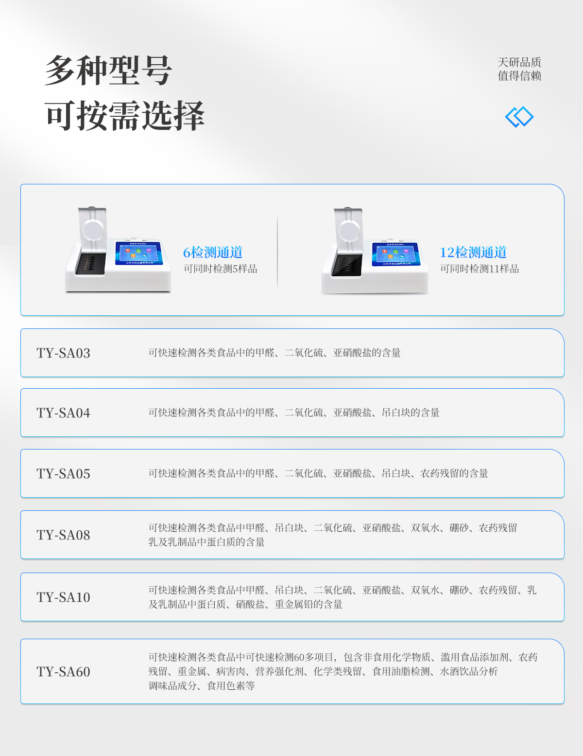 | 儀器采用臺(tái)式一體化系統(tǒng)檢測(cè)技術(shù),將分光光度模塊、新型農(nóng)殘檢測(cè)模塊、數(shù)字化管理模塊、無(wú)線通訊模塊高度集成于一體,支持檢測(cè)200種食品安全檢測(cè)項(xiàng)目,同時(shí)預(yù)留升級(jí)檢測(cè)方法。 | 儀器檢測(cè)模塊標(biāo)準(zhǔn)化、智能化,可隨意自由組合。檢測(cè)箱體內(nèi)置多個(gè)標(biāo)準(zhǔn)檢測(cè)單元,檢測(cè)模塊可以調(diào)整配置。 | 儀器采用全新安卓智能系統(tǒng),主控芯片采用 ARM Cortex-A7,RK3288/4核處理器,10.1寸高清液晶觸摸豎屏,更加**的UI交互界面,運(yùn)轉(zhuǎn)快捷;儀器配備無(wú)線通信模塊: 4G(APN)通訊模塊、Wifi模塊,藍(lán)牙傳輸,同時(shí)具有雙USB接口以及RJ45接口能以多種方式實(shí)現(xiàn)數(shù)據(jù)保存和數(shù)據(jù)傳輸功能。 | 創(chuàng)新檢測(cè)模式: | ★檢測(cè)通道:≥12通道;采用精密旋轉(zhuǎn)比色池設(shè)計(jì),使用同芯片同光源校準(zhǔn)精度,解決不同光源之間的誤差值。1-12通道間誤差0.1%。(專(zhuān)利號(hào):ZL202022821055.2) | ★儀器具有自動(dòng)識(shí)別比色皿檢測(cè)功能,即:將樣品比色皿放入儀器后,點(diǎn)擊樣品檢測(cè),儀器自動(dòng)識(shí)別比色皿進(jìn)行通道檢測(cè)。 | 進(jìn)口高精光源: | 高精度進(jìn)口四波長(zhǎng)冷光源,通道配置 410、520、590、630nm 波長(zhǎng)光源,一個(gè)光源芯片驅(qū)動(dòng)一個(gè)光源,誤差極小,每臺(tái)設(shè)備單獨(dú)**校準(zhǔn)光源,**比對(duì),同時(shí)參照四種不同波段光源全方位覆蓋市面上99%的農(nóng)殘食品項(xiàng)目檢測(cè)。 | 智能化操作系統(tǒng): | 便捷操作系統(tǒng):設(shè)備檢測(cè)時(shí)可在同一檢測(cè)界面自動(dòng)對(duì)應(yīng)相關(guān)檢測(cè)通道一次性選擇1-12個(gè)樣品名稱,無(wú)須退出界面,節(jié)省操作時(shí)間。 | 數(shù)據(jù)集成系統(tǒng):設(shè)備首頁(yè)自動(dòng)統(tǒng)計(jì)檢測(cè)數(shù)據(jù)包含:周檢測(cè)數(shù)據(jù)、月檢測(cè)數(shù)據(jù),全部檢測(cè)總數(shù)量,均包含檢測(cè)總數(shù),合格數(shù),不合格數(shù),以及相關(guān)柱形分析圖,對(duì)各項(xiàng)檢測(cè)數(shù)據(jù)清晰掌握,無(wú)需電腦查詢,更加快捷直觀。 | 項(xiàng)目預(yù)設(shè)系統(tǒng):支持添加單個(gè)及多個(gè)相同或不相同的任務(wù)預(yù)設(shè),一鍵快速調(diào)取,每一個(gè)任務(wù)分別可以設(shè)置不同的樣品、批次、編號(hào)、來(lái)源、備注、抽樣信息、檢測(cè)信息、受檢信息、復(fù)核信息等更多信息。無(wú)縫鏈接平臺(tái)和APP實(shí)時(shí)查看下發(fā)任務(wù)。 | 數(shù)據(jù)監(jiān)管系統(tǒng):同步對(duì)接監(jiān)管平臺(tái),數(shù)據(jù)可局域網(wǎng)和互聯(lián)網(wǎng)數(shù)據(jù)上傳,檢測(cè)結(jié)果可選擇直接傳至食品安全監(jiān)管平臺(tái)。集成OSS輸出存儲(chǔ)服務(wù)、區(qū)分設(shè)備定向管理應(yīng)用,進(jìn)行區(qū)域食品安全監(jiān)管及大數(shù)據(jù)分析處理與數(shù)據(jù)統(tǒng)計(jì),檢測(cè)區(qū)域食品安全長(zhǎng)短期動(dòng)態(tài),達(dá)到食品安全問(wèn)題預(yù)估、預(yù)警。 | 自定義打印系統(tǒng):內(nèi)置全新打印系統(tǒng),新創(chuàng)自定義打印方式,可按需靈活設(shè)置開(kāi)啟或關(guān)閉:產(chǎn)品合格證(國(guó)家農(nóng)業(yè)部標(biāo)準(zhǔn)要求),二維碼,抽樣信息、檢測(cè)信息,受檢信息、復(fù)核信息、抽樣日期、檢測(cè)日期等信息的打印。 | 系統(tǒng)遠(yuǎn)程更新功能:可定向分客戶分儀器更新系統(tǒng),按照不同客戶后期實(shí)際需求添加項(xiàng)目,無(wú)需機(jī)器返廠,即可遠(yuǎn)程實(shí)時(shí)升級(jí)全新系統(tǒng),節(jié)省時(shí)間成本及避免運(yùn)輸造成設(shè)備損壞。 | 儀器主機(jī)采用一體化防水、抗壓、防撞擊、防腐蝕箱體設(shè)計(jì),同時(shí)配備交直流供電,可連接車(chē)載電源,可選配大容量充電鋰電池,滿足現(xiàn)場(chǎng)野外檢測(cè)需求。 | 安全證書(shū),放心保障:儀器具有中國(guó)計(jì)量科學(xué)研究院校準(zhǔn)證書(shū),**認(rèn)證。 |