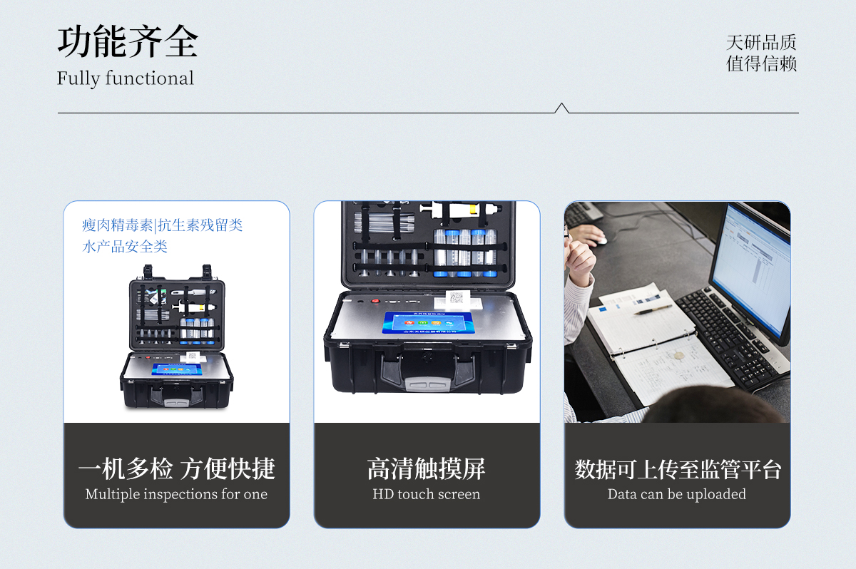 | 安卓智能操作系統(tǒng),采用更加**和人性化操作,儀器具有網(wǎng)線連接、wifi聯(lián)網(wǎng)上傳、4G無(wú)線遠(yuǎn)傳功能,快速上傳數(shù)據(jù)。 | 智能化程度高,儀器具有自檢功能:具有開機(jī)自檢和調(diào)零功能,具有自動(dòng)檢測(cè)重復(fù)性功能。 | 新一代高速熱敏打印機(jī),檢測(cè)完成可自動(dòng)打印檢測(cè)報(bào)告和二維碼。 | 儀器帶有監(jiān)管平臺(tái)。數(shù)據(jù)可局域網(wǎng)和互聯(lián)網(wǎng)數(shù)據(jù)上傳,檢測(cè)結(jié)果直接傳至食品安全監(jiān)管平臺(tái)。進(jìn)行區(qū)域食品安全監(jiān)管及大數(shù)據(jù)分析處理與數(shù)據(jù)統(tǒng)計(jì),檢測(cè)區(qū)域食品安全長(zhǎng)短期動(dòng)態(tài),達(dá)到食品安全問題預(yù)估、預(yù)警。 | 一體化便攜式快檢設(shè)備,滿足現(xiàn)場(chǎng)及流動(dòng)檢測(cè)使用需求,能夠在同一軟件下實(shí)現(xiàn)所有檢測(cè)項(xiàng)目的檢測(cè),并可通過同一窗口直觀顯示檢測(cè)結(jié)果。 | 膠體金模塊檢測(cè)方式:軌道式自動(dòng)傳輸掃描,檢測(cè)完成后自動(dòng)退出檢測(cè)卡。 | CT線自動(dòng)識(shí)別,無(wú)需手動(dòng)調(diào)整。 | 儀器具有品類多種類樣品菜單庫(kù),可靈活選擇檢測(cè)樣品,不同的檢測(cè)通道可同時(shí)檢測(cè)不同的樣品項(xiàng)目。 | 樣品處理簡(jiǎn)單省力,整體操作快速、安全、便捷。 | 儀器具有自身保護(hù)功能,可設(shè)置用戶名及密碼,防止非工作人員操作等。 | 高靈敏度,高檢測(cè)精度,高重復(fù)性精度,掃描式高精度光學(xué)傳感器。 | 內(nèi)置強(qiáng)大的數(shù)據(jù)庫(kù),可在儀器上直接選擇樣品名稱、檢測(cè)指標(biāo)、送檢單位等信息,也可在儀器上直接編輯錄入樣品名稱、檢測(cè)指標(biāo)、送檢單位等信息并保存進(jìn)樣品數(shù)據(jù)庫(kù)。 | 儀器具有重新校準(zhǔn)、鎖定、恢復(fù)出廠設(shè)置功能。 | 支持U盤存儲(chǔ)。 結(jié)果判定線可修改,對(duì)照值標(biāo)定值可保存,斷電不丟失數(shù)據(jù)。 | 兼容市場(chǎng)上所有的膠體金卡,使用耗材不受限制,極大增強(qiáng)用戶使用體驗(yàn)。 |