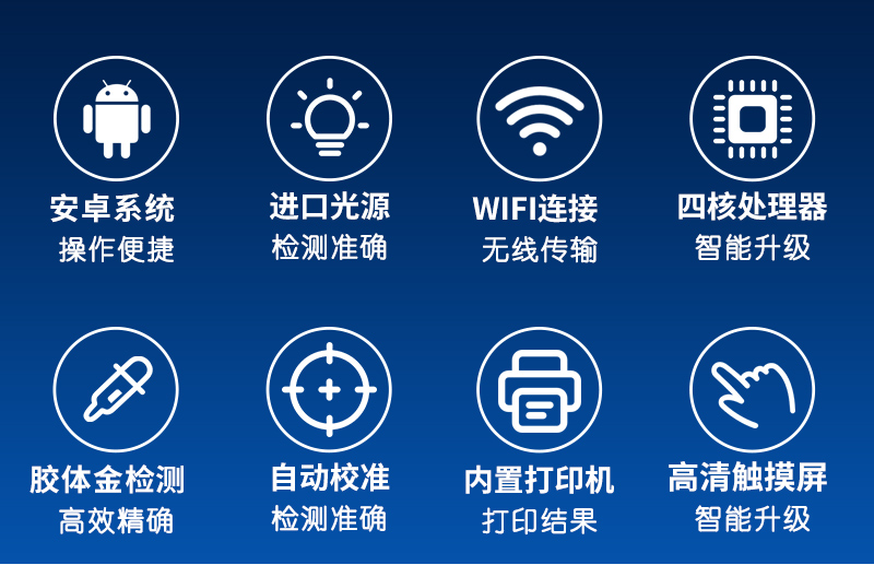 | 七寸彩屏全觸摸輸入,支持手寫功能支持WIFI,支持3G、4G; | 支持金標(biāo)項目檢測定性檢測,結(jié)果可顯示樣品陰陽性結(jié)果 | 內(nèi)置智能操作系統(tǒng)軟件內(nèi)置大容量存儲數(shù)據(jù)庫,可隨時分類查詢已測項目; | ☆數(shù)據(jù)可局域網(wǎng)和互聯(lián)網(wǎng)數(shù)據(jù)上傳,可構(gòu)建食品安全監(jiān)管系統(tǒng)平臺,支持LIMS 系統(tǒng),內(nèi)置USB接口,可擴(kuò)展外設(shè); | ☆自動精準(zhǔn)識別CT線位置,糾錯范圍可達(dá)±3mm; | 支持金標(biāo)項目檢測定性檢測,結(jié)果可顯示樣品陰陽性結(jié)果; | 檢測響應(yīng)時間:< 3S | 讀數(shù)精度:CV<1% ; | 12V低壓電源供電,便攜式設(shè)計,適合野外,車載或室內(nèi)等各種場所使用 |