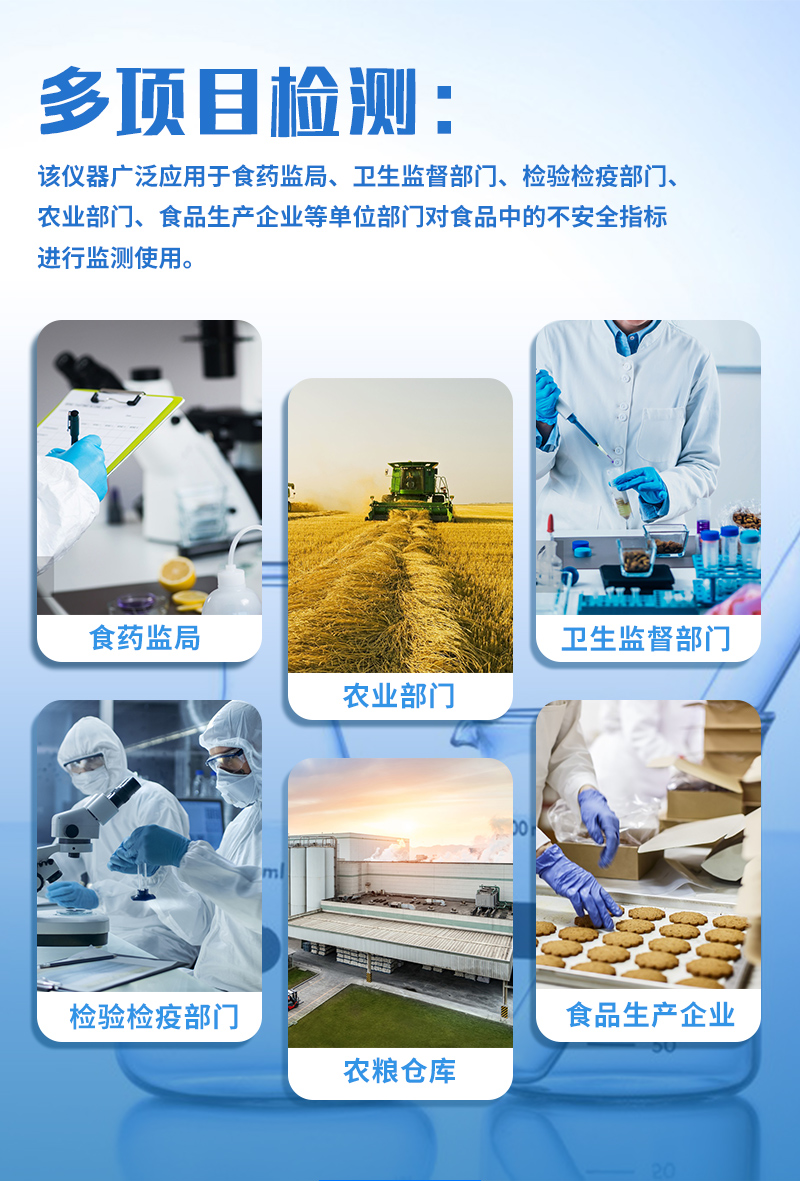 金標(biāo)度數(shù)儀快速定量檢測獸藥殘留、抗生素類殘留、激素類殘留、毒素類殘留,化學(xué)類殘留等幾十種項目并可根據(jù)用戶需要擴(kuò)充新的檢測項目如農(nóng)藥殘留、食品添加劑、色素、可現(xiàn)場快速檢測農(nóng)藥殘留、鹽酸克倫特羅、沙丁胺醇、萊克多巴胺、四環(huán)素類、硝基呋喃類、磺胺類、沙星類、氯霉素、孔雀石綠磺胺類、豬藍(lán)耳病毒、豬瘟病毒、黃曲霉毒素B1、豬偽狂犬病毒、豬偽狂犬病毒gE蛋白、豬口蹄疫3ABC蛋白、豬口蹄疫病毒IgG、豬細(xì)小病毒、雞禽流感等定性和定量快速檢測等、并且可以連接食品安全監(jiān)控系統(tǒng)。