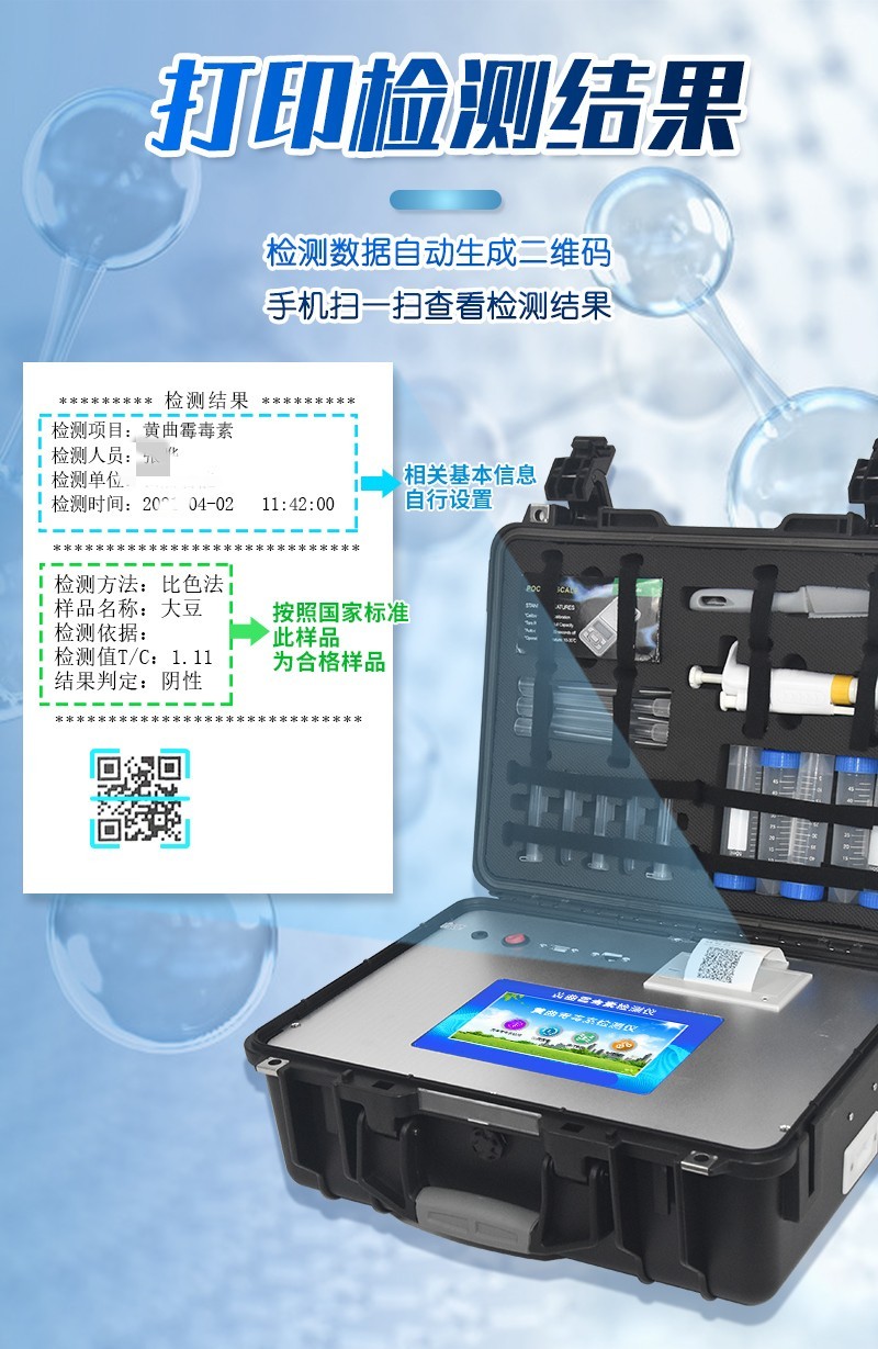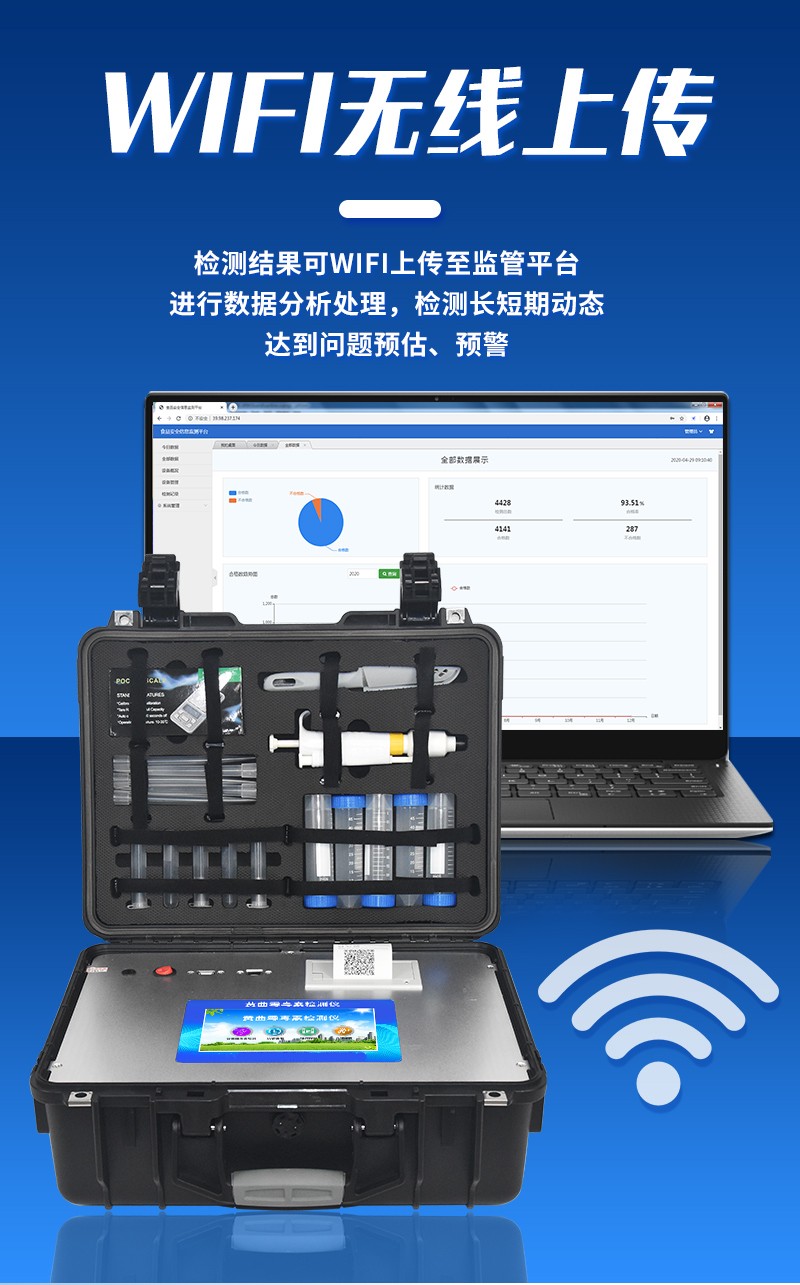 | 工作模式:安卓5.1系統(tǒng)模式 | 軟件支持:安卓軟件平臺 | ☆檢測項目:可檢測農(nóng)藥殘留、食品添加劑、色素、可現(xiàn)場快速檢測農(nóng)藥殘留、鹽酸克倫特羅、沙丁胺醇、萊克多巴胺、四環(huán)素類、硝基呋喃類、磺胺類、沙星類、氯霉素、孔雀石綠磺胺類,并且可以連接食品安全監(jiān)控系統(tǒng)。 | 測量原理:光電池測量反射衰減信號強(qiáng)度; | 測量速度:≤5s; | 儲存功能:儲存至少20000個結(jié)果數(shù)據(jù),支持自定義查詢; | 藍(lán)牙模塊:藍(lán)牙4.2 | 檢測精度:CV值小于1%(標(biāo)準(zhǔn)卡),批間差小于3%(標(biāo)準(zhǔn)卡); | 檢測輸出:支持色度檢測,CT比值檢測,T線檢測等多種擬合方式; | 內(nèi)置熱敏打印機(jī) | ☆數(shù)據(jù)輸出:內(nèi)置WIFI,支持無線數(shù)據(jù)上傳,標(biāo)準(zhǔn)RS232串口,網(wǎng)絡(luò)接口和USB2.0接口; | ☆內(nèi)置食品安全信息系統(tǒng),一鍵數(shù)據(jù)上傳。 | 儀器外形尺寸:300*250*79mm | ☆操作系統(tǒng)配置:7吋液晶屏、4核處理器、1600萬像素 | 凈重:2.0kg。 |