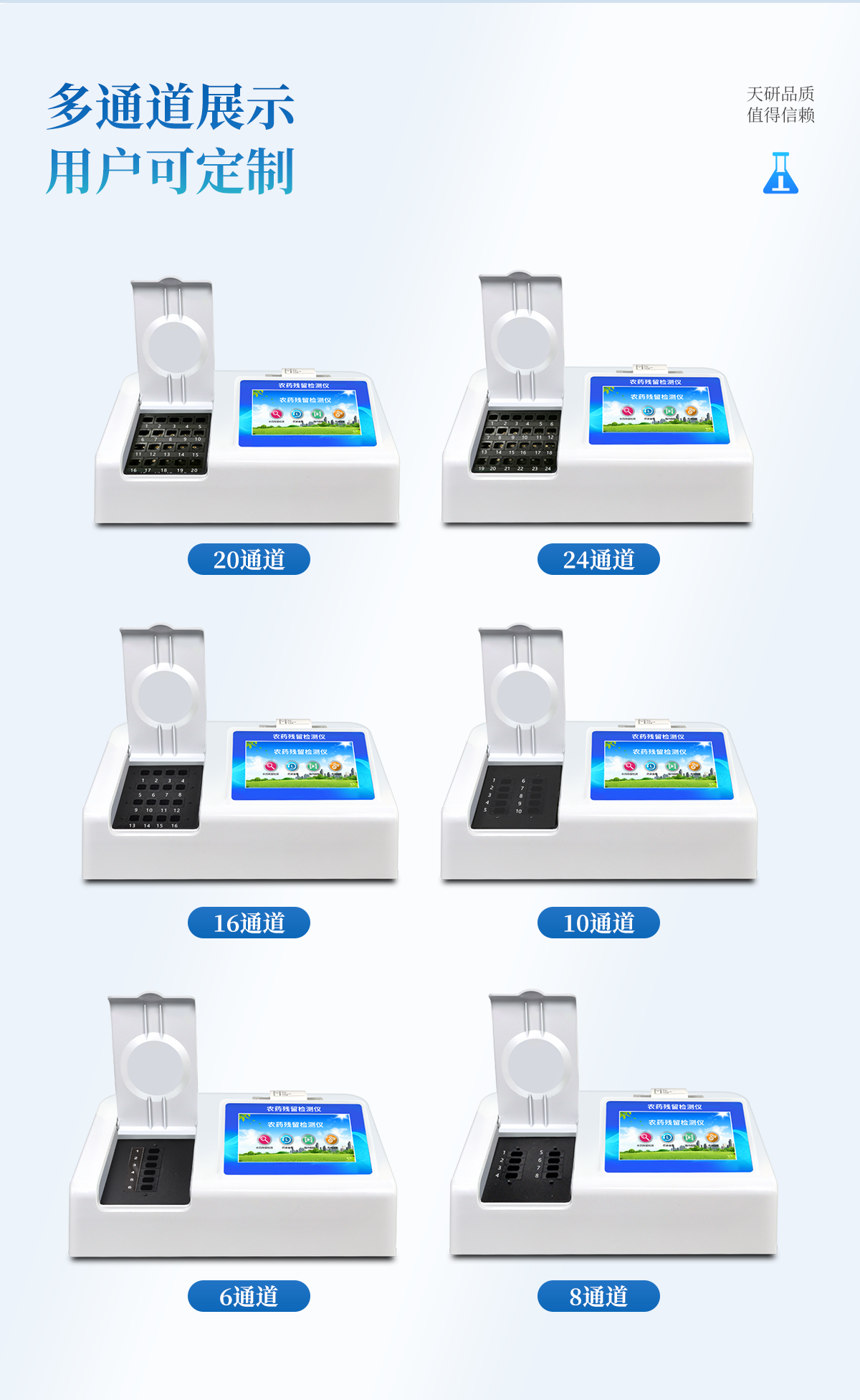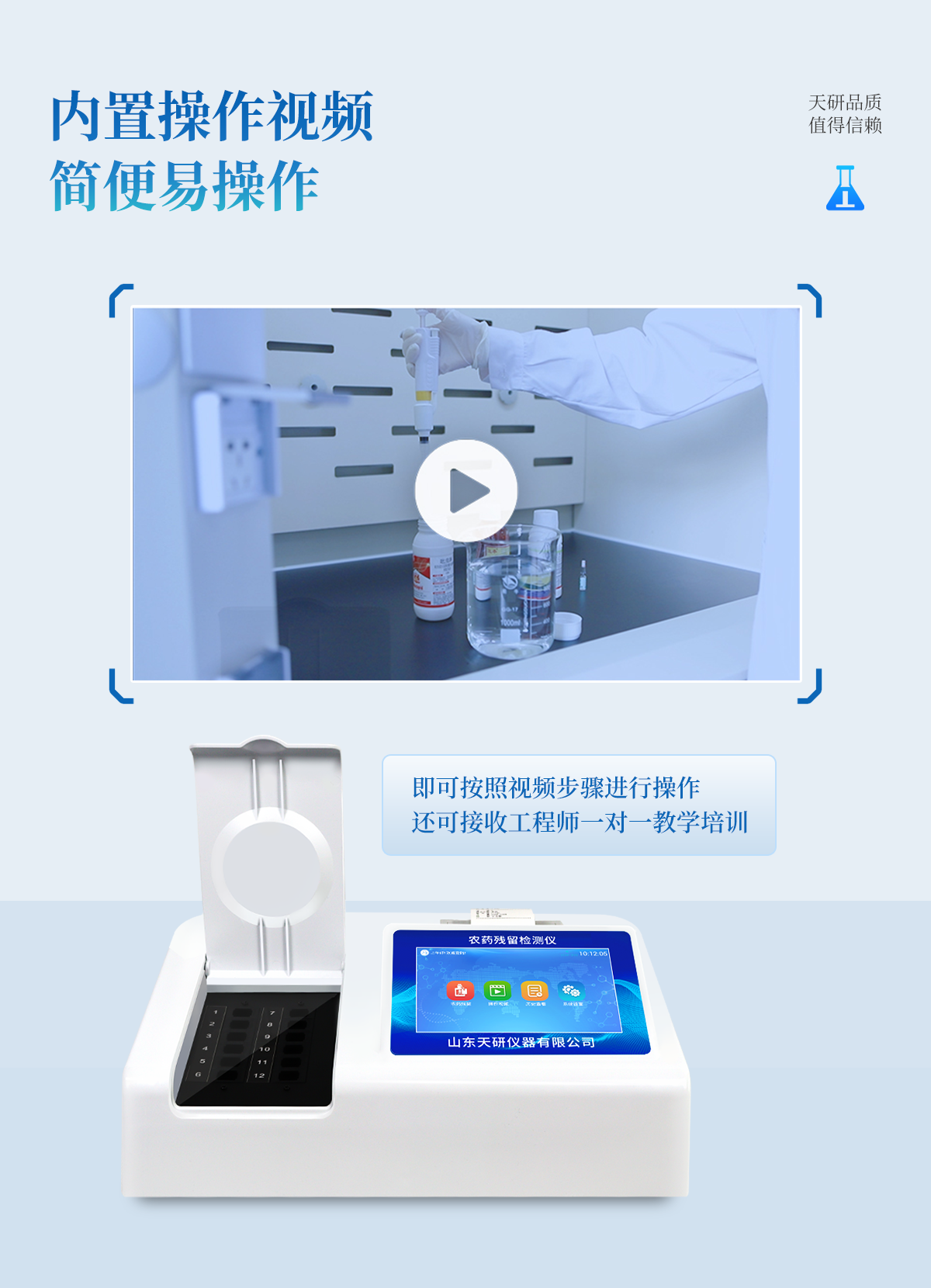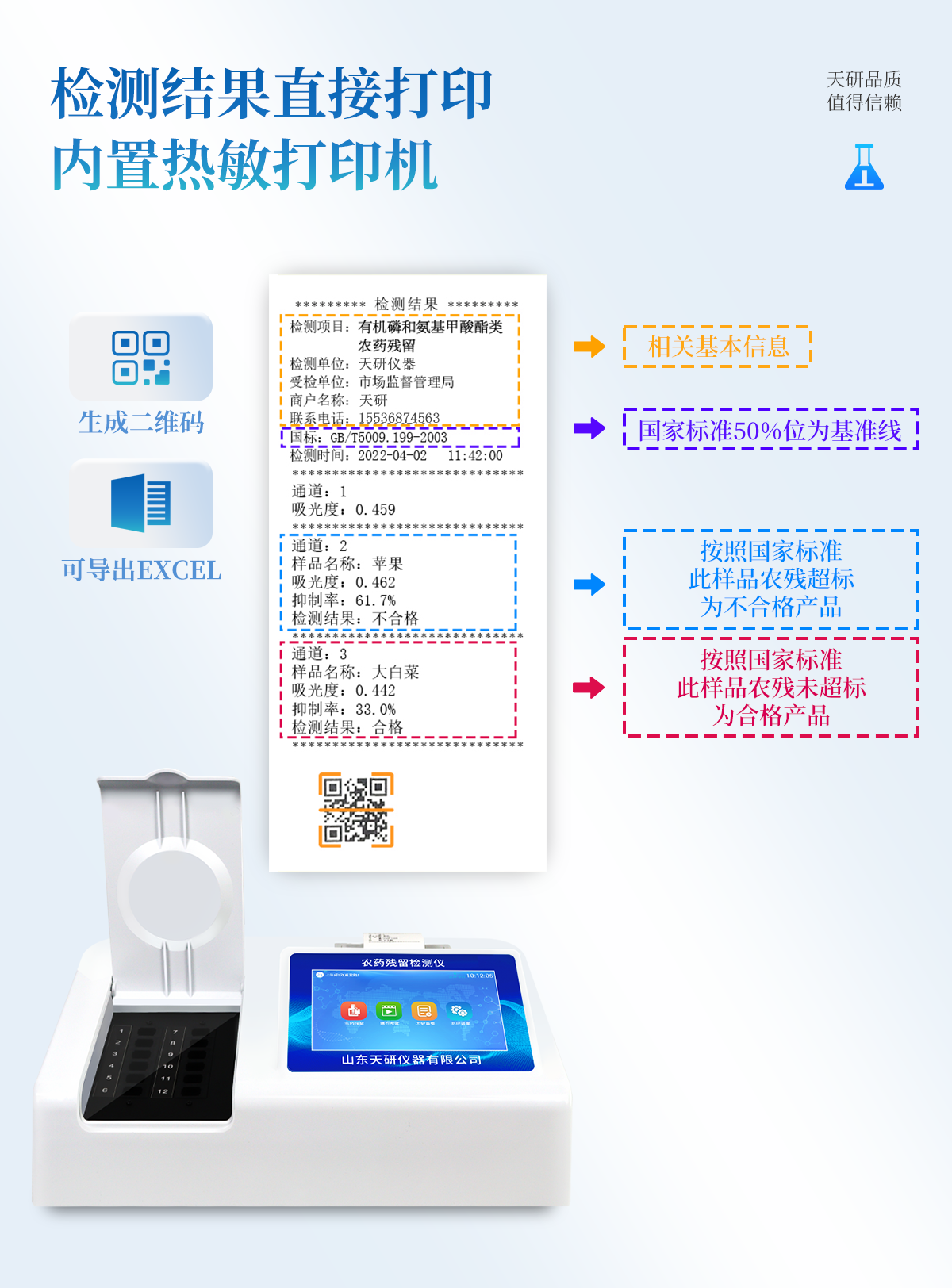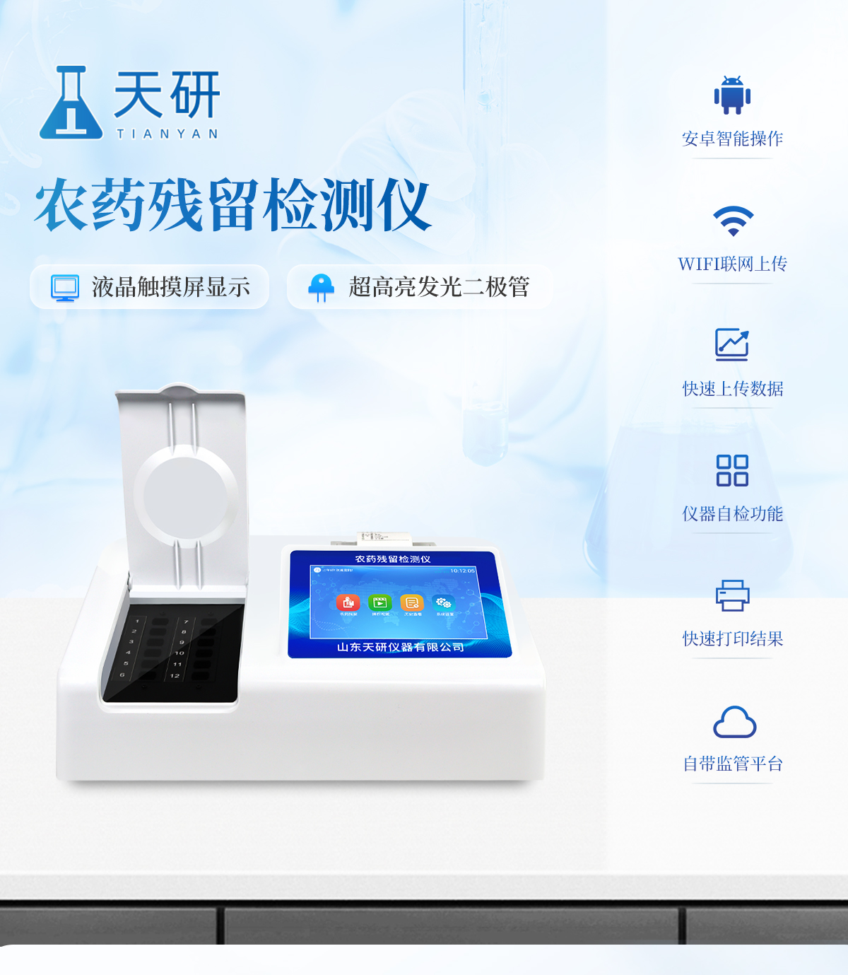 | 乙酰膽堿酯酶和丁酰膽堿酯酶試劑均可以使用,符合國(guó)家標(biāo)準(zhǔn)和農(nóng)業(yè)部標(biāo)準(zhǔn)的要求。 | 自動(dòng)判斷樣品是否合格,檢測(cè)結(jié)果更加直觀。 | 儀器具有100多種蔬菜名稱菜單庫(kù),分類管理,并可按需添加或刪除蔬菜名,編輯蔬菜名稱,可直接打印出蔬菜名稱。 | 檢測(cè)通道:12個(gè)檢測(cè)通道,可以同時(shí)測(cè)試多個(gè)樣品,循環(huán)檢測(cè),即放即檢,每個(gè)樣品由程序控制分別獨(dú)立工作,不會(huì)互相干擾。 | 智能操作系統(tǒng),采用更加人性化操作,主控采用多核處理器,主頻1.88Ghz,運(yùn)轉(zhuǎn)速度更快速,穩(wěn)定性更強(qiáng)。 | 顯示方式:7英寸高靈敏真彩觸摸屏顯示,人性化中文操作界面,讀數(shù)直觀、簡(jiǎn)單。 | 打印機(jī)采用串口5v打印,可選擇手動(dòng)打印或者自動(dòng)打印,三分鐘出打印結(jié)果,打印格式為檢測(cè)人姓名、吸光度差值、檢測(cè)時(shí)間、檢測(cè)機(jī)構(gòu)、樣品名稱及結(jié)果判定。 | 光源采用進(jìn)口超高亮發(fā)光二極管,具有低功耗、高精度、穩(wěn)定性強(qiáng)、光源可控可以關(guān)掉不使用的光源,響應(yīng)速度快等優(yōu)點(diǎn)。 | 智能恒流穩(wěn)壓,光強(qiáng)自動(dòng)校準(zhǔn),長(zhǎng)時(shí)間連續(xù)工作光源無(wú)溫漂現(xiàn)象。 | 儀器具有GPRS遠(yuǎn)傳功能,可插手機(jī)卡實(shí)現(xiàn)數(shù)據(jù)遠(yuǎn)傳平臺(tái),wifi聯(lián)網(wǎng)功能,可將數(shù)據(jù)快速上傳電腦,進(jìn)行數(shù)據(jù)管理與統(tǒng)計(jì)。 | 采用USB2.0接口設(shè)計(jì),方便數(shù)據(jù)的存貯和移動(dòng),并可隨時(shí)與計(jì)算機(jī)直接相連,并且可用計(jì)算機(jī)控制儀器。實(shí)現(xiàn)數(shù)據(jù)查詢、瀏覽、分析、統(tǒng)計(jì)、打印等。 | 智能化程度高,儀器具有自檢功能:具有開機(jī)自檢和調(diào)零功能,具有自動(dòng)檢測(cè)重復(fù)性功能 | 儀器具有自身保護(hù)功能,可設(shè)置用戶名及密碼,防止非工作人員操作等。 | 采用DC12v直流供電,安全系統(tǒng)更高,并且配備6A鋰電池充電器。 | 儀器具有重新校準(zhǔn)、鎖定、恢復(fù)出廠設(shè)置功能。 |