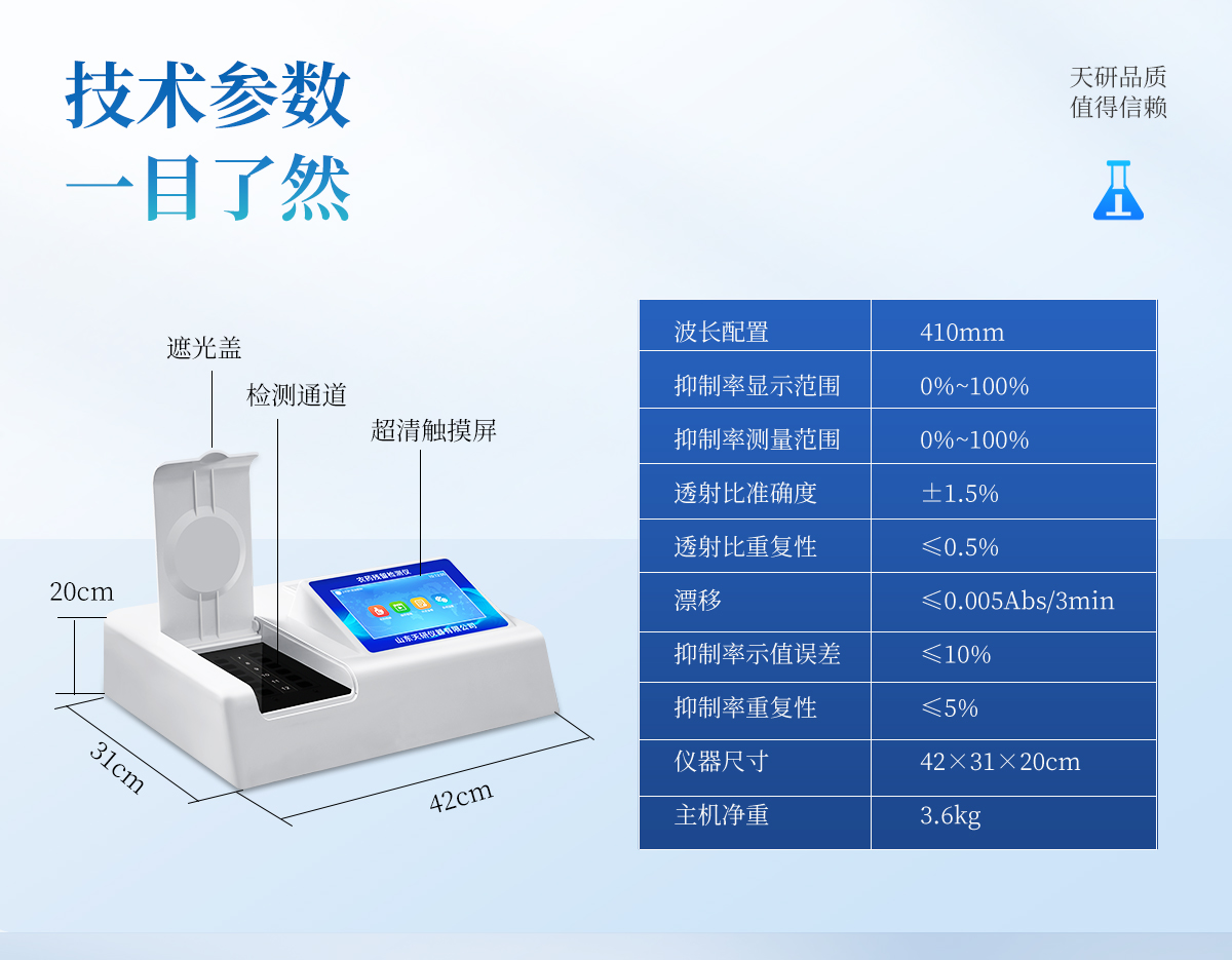 | 410nm | 0%~100% | 0%~100% | ±1.5% | ≤0.5% | ≤0.005Abs/3min | ≤10% | ≤5% | 42×31×20cm | 3.6kg |