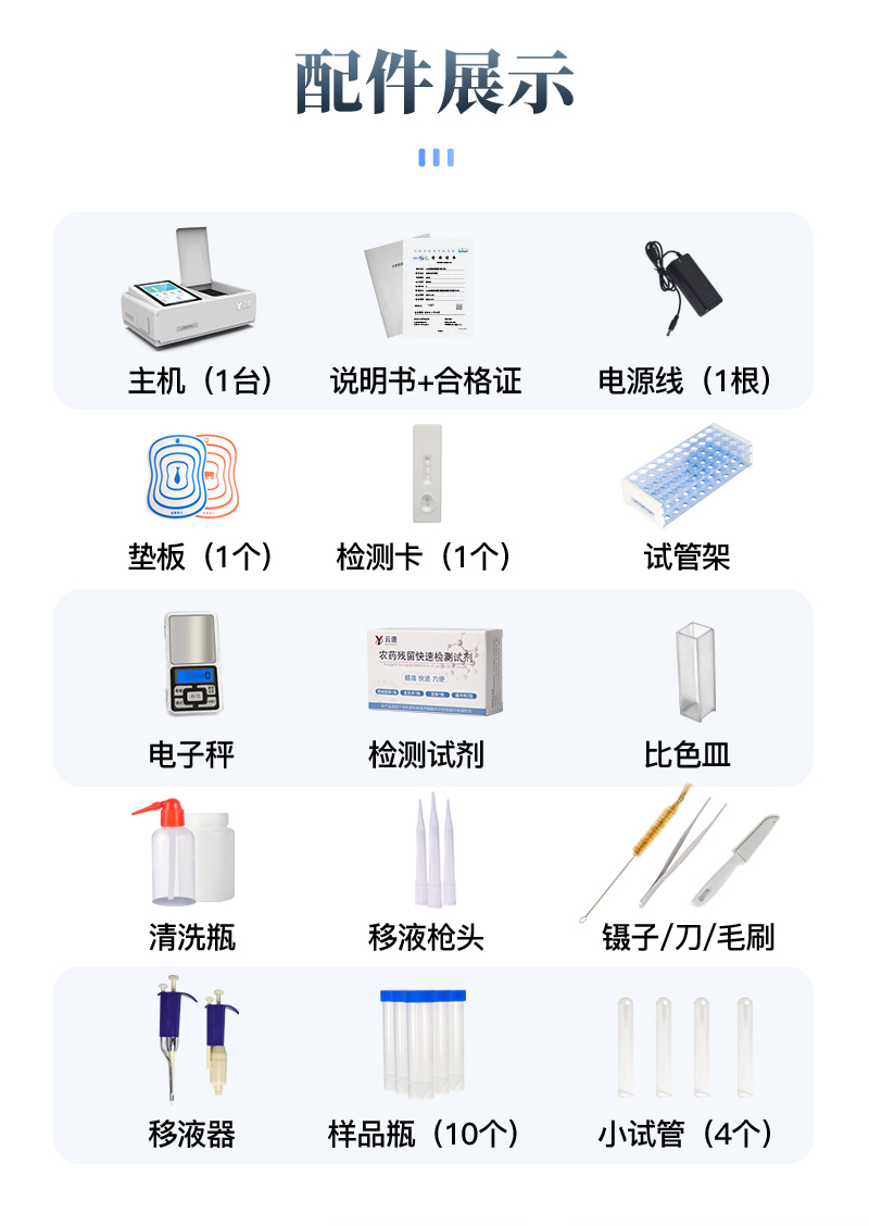 | 儀器采用臺式一體化系統(tǒng)檢測技術(shù),將分光光度模塊、新型農(nóng)殘檢測模塊、數(shù)字化管理模塊、無線通訊模塊高度集成于一體,支持檢測200種食品安全檢測項目,同時預(yù)留升級檢測方法。 | 儀器檢測模塊標(biāo)準(zhǔn)化、智能化,可隨意自由組合。檢測箱體內(nèi)置多個標(biāo)準(zhǔn)檢測單元,檢測模塊可以調(diào)整配置。 | 儀器采用全新安卓智能系統(tǒng),主控芯片采用 ARM Cortex-A7,RK3288/4核處理器,10.1寸高清液晶觸摸豎屏,更加**的UI交互界面,運轉(zhuǎn)快捷;儀器配備無線通信模塊: 4G(APN)通訊模塊、Wifi模塊,藍牙傳輸,同時具有雙USB接口以及RJ45接口能以多種方式實現(xiàn)數(shù)據(jù)保存和數(shù)據(jù)傳輸功能。 | 創(chuàng)新檢測模式: | ★檢測通道:≥12通道;采用精密旋轉(zhuǎn)比色池設(shè)計,使用同芯片同光源校準(zhǔn)精度,解決不同光源之間的誤差值。1-12通道間誤差0.1%。(專利號:ZL202022821055.2) | ★儀器具有自動識別比色皿檢測功能,即:將樣品比色皿放入儀器后,點擊樣品檢測,儀器自動識別比色皿進行通道檢測。 | 進口高精光源: | 高精度進口四波長冷光源,通道配置 410、520、590、630nm 波長光源,一個光源芯片驅(qū)動一個光源,誤差極小,每臺設(shè)備單獨**校準(zhǔn)光源,**比對,同時參照四種不同波段光源全方位覆蓋市面上99%的農(nóng)殘食品項目檢測。 | 智能化操作系統(tǒng): | 便捷操作系統(tǒng):設(shè)備檢測時可在同一檢測界面自動對應(yīng)相關(guān)檢測通道一次性選擇1-12個樣品名稱,無須退出界面,節(jié)省操作時間。 | 數(shù)據(jù)集成系統(tǒng):設(shè)備首頁自動統(tǒng)計檢測數(shù)據(jù)包含:周檢測數(shù)據(jù)、月檢測數(shù)據(jù),全部檢測總數(shù)量,均包含檢測總數(shù),合格數(shù),不合格數(shù),以及相關(guān)柱形分析圖,對各項檢測數(shù)據(jù)清晰掌握,無需電腦查詢,更加快捷直觀。 | 項目預(yù)設(shè)系統(tǒng):支持添加單個及多個相同或不相同的任務(wù)預(yù)設(shè),一鍵快速調(diào)取,每一個任務(wù)分別可以設(shè)置不同的樣品、批次、編號、來源、備注、抽樣信息、檢測信息、受檢信息、復(fù)核信息等更多信息。無縫鏈接平臺和APP實時查看下發(fā)任務(wù)。 | 數(shù)據(jù)監(jiān)管系統(tǒng):同步對接監(jiān)管平臺,數(shù)據(jù)可局域網(wǎng)和互聯(lián)網(wǎng)數(shù)據(jù)上傳,檢測結(jié)果可選擇直接傳至食品安全監(jiān)管平臺。集成OSS輸出存儲服務(wù)、區(qū)分設(shè)備定向管理應(yīng)用,進行區(qū)域食品安全監(jiān)管及大數(shù)據(jù)分析處理與數(shù)據(jù)統(tǒng)計,檢測區(qū)域食品安全長短期動態(tài),達到食品安全問題預(yù)估、預(yù)警。 | 自定義打印系統(tǒng):內(nèi)置全新打印系統(tǒng),新創(chuàng)自定義打印方式,可按需靈活設(shè)置開啟或關(guān)閉:產(chǎn)品合格證(國家農(nóng)業(yè)部標(biāo)準(zhǔn)要求),二維碼,抽樣信息、檢測信息,受檢信息、復(fù)核信息、抽樣日期、檢測日期等信息的打印。 | 系統(tǒng)遠程更新功能:可定向分客戶分儀器更新系統(tǒng),按照不同客戶后期實際需求添加項目,無需機器返廠,即可遠程實時升級全新系統(tǒng),節(jié)省時間成本及避免運輸造成設(shè)備損壞。 | 儀器主機采用一體化防水、抗壓、防撞擊、防腐蝕箱體設(shè)計,同時配備交直流供電,可連接車載電源,可選配大容量充電鋰電池,滿足現(xiàn)場野外檢測需求。 | 安全證書,放心保障:儀器具有中國計量科學(xué)研究院校準(zhǔn)證書,**認(rèn)證。 |
