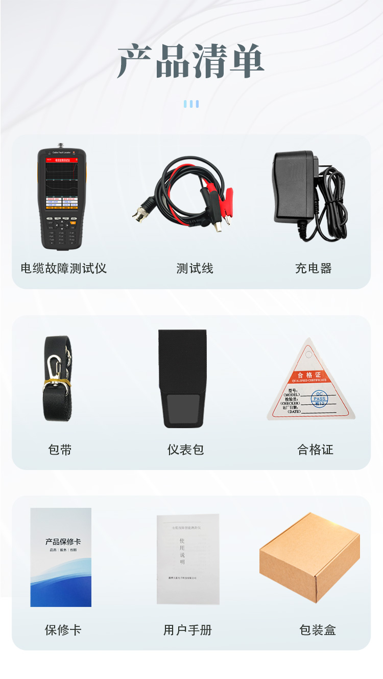 | 電纜故障測(cè)試儀......1 | 測(cè)試線X......1 | 充電器......1 | 包帶......1 | 儀表包......1 | 合格證......1 | 保修卡......1 | 用戶手冊(cè)......1 | 包裝盒......1 |