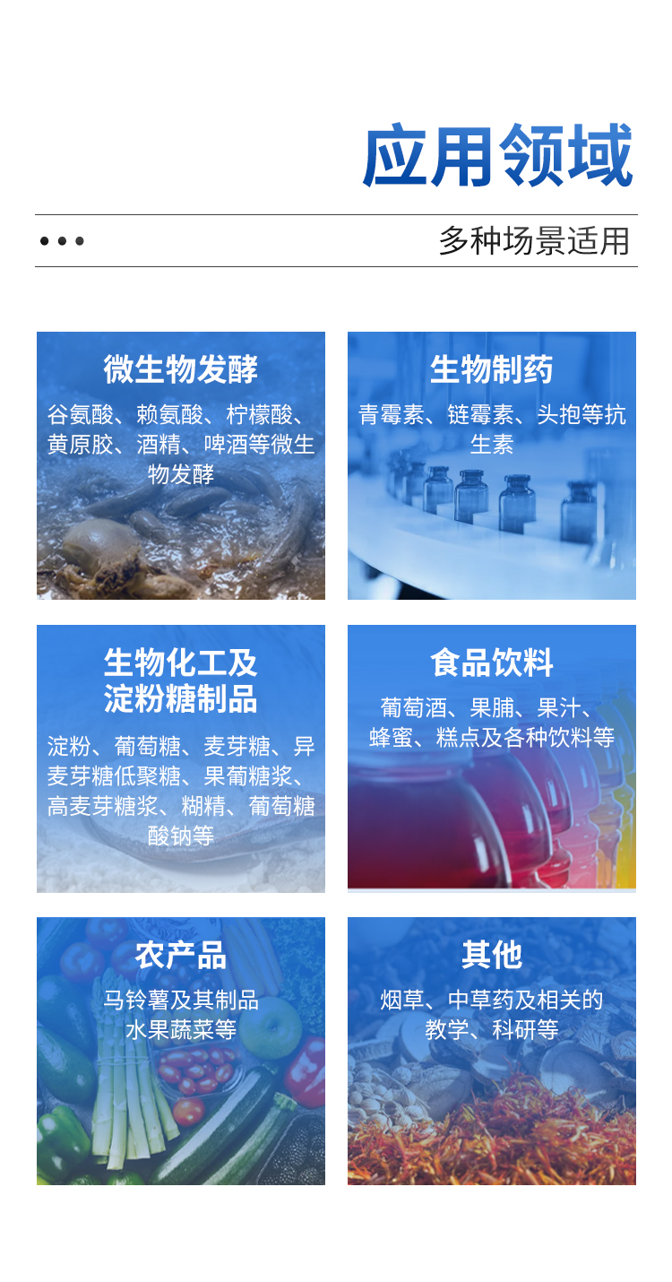 | 微生物發(fā)酵:谷氨酸、賴氨酸、檸檬酸、黃原膠、酒精、啤酒等微生物發(fā)酵 | 生物制藥:青霉素、鏈霉素、頭抱等抗生素 。生物化工及淀粉糖制品: | 淀粉、葡萄糖、麥芽糖、異麥芽糖低聚糖、果葡糖漿、高麥芽糖漿、糊精、葡萄糖酸鈉等。 | 食品飲料:葡萄酒、果脯、果汁、蜂蜜、糕點及各種飲料等。馬鈴薯及其制品、水果 | 蔬菜等農(nóng)產(chǎn)品 | 其他:煙草、中草藥及相關的教學、科研等 |