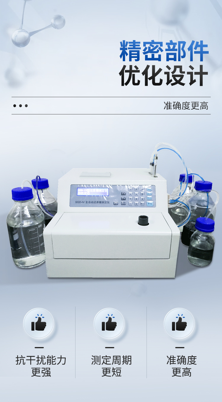 全自動還原糖測定儀是根據(jù)費林試劑測定原理設計而成的,其原理與目前國家標準一致。IV型全自動還原糖測定儀實現(xiàn)試劑泵、滴定泵自動排氣泡,操控更方便;采用精密部件優(yōu)化設計,準確度更高;測定時間縮短至3分鐘以內,測定速度更快;液晶屏顯示更直觀。