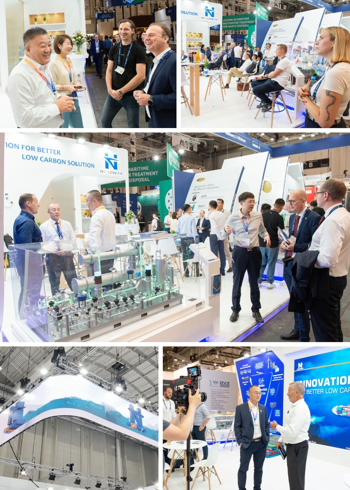 始于1963年的德國漢堡國際海事展覽會(SMM),是目前全球海事界規模最大、專業水平最高、影響力最強的國際貿易展覽會。本屆展會現場,海德威展出了涵蓋甲醇燃料供給系統、氨燃料供給系統、船舶尾氣脫硫系統、碳捕集與再利用系統、壓載水處理系統等為核心的低碳航運產品生態,以及固態儲氫、AEM制氫、二氧化碳加綠氫合成綠色甲醇等行業最新前沿技術。