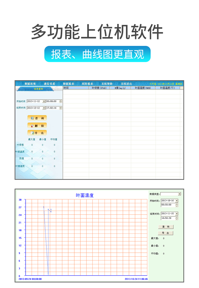 | 葉綠素測定儀TY-YB可同時測量葉綠素、葉面溫度兩個參數(shù),帶上位機軟件功能,數(shù)據(jù)可導出。 | 快速無損植物活體檢測,不影響植物成長。 | 一次操作可同時測定所有參數(shù),實時顯示,且可同時儲存 | 歷史數(shù)據(jù)查看,即可順序查看,也可跳轉查看。 | 測量數(shù)據(jù)可連接計算機將測量數(shù)據(jù)導出,便于管理和分析。 | 歷史數(shù)據(jù)查看,即可順序查看,也可跳轉查看。 | 意外斷電后已保存在主機里的數(shù)據(jù)不丟失。 | 對于歷史數(shù)據(jù)即可逐條刪除,也可以一鍵式全部刪除。 | 使用鋰電池供電,帶背光功能。 | 中英文一鍵式切換。 | 上位機軟件功能(YT-YB型): | 每種參數(shù)的報表、曲線圖均可選擇時段查詢查看。 | 顯示每種參數(shù)過程曲線趨勢,最大值、最小值、平均值顯示查看,放大、縮小功能。 | 可將存儲記錄的數(shù)據(jù)以EXCEL格式備份保存,方便以后調用。 | 可將存儲記錄的數(shù)據(jù)曲線圖以BMP圖片格式備份保存,方便以后調用。 |