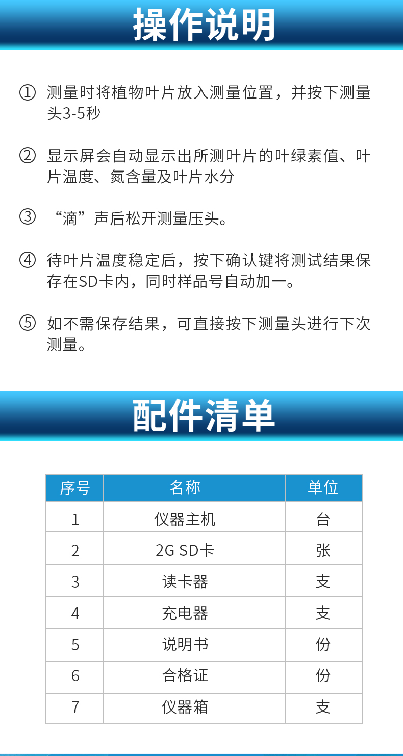 | 測量范圍:葉綠素:0.0-99.9SPAD | 葉面溫度:-10-99.9℃ | 測量精度:葉綠素:±1.0 SPAD單位以內(nèi) (室溫下,SPAD值介于0-50) | 葉面溫度:±0.5℃ | 重 復 性:葉綠素:±0.3 SPAD單位以內(nèi) (SPAD值介于0-50) | 葉面溫度:±0.2℃ | 測量面積:2mm*2mm | 測量時間間隔:小于3秒 | 數(shù)據(jù)存儲容量:16G | 電源:4.2V可充電鋰電池 | 電池容量:2000mah | 重量:200g | 工作及存儲環(huán)境:-10℃~50℃ ≤85%相對濕度 |
