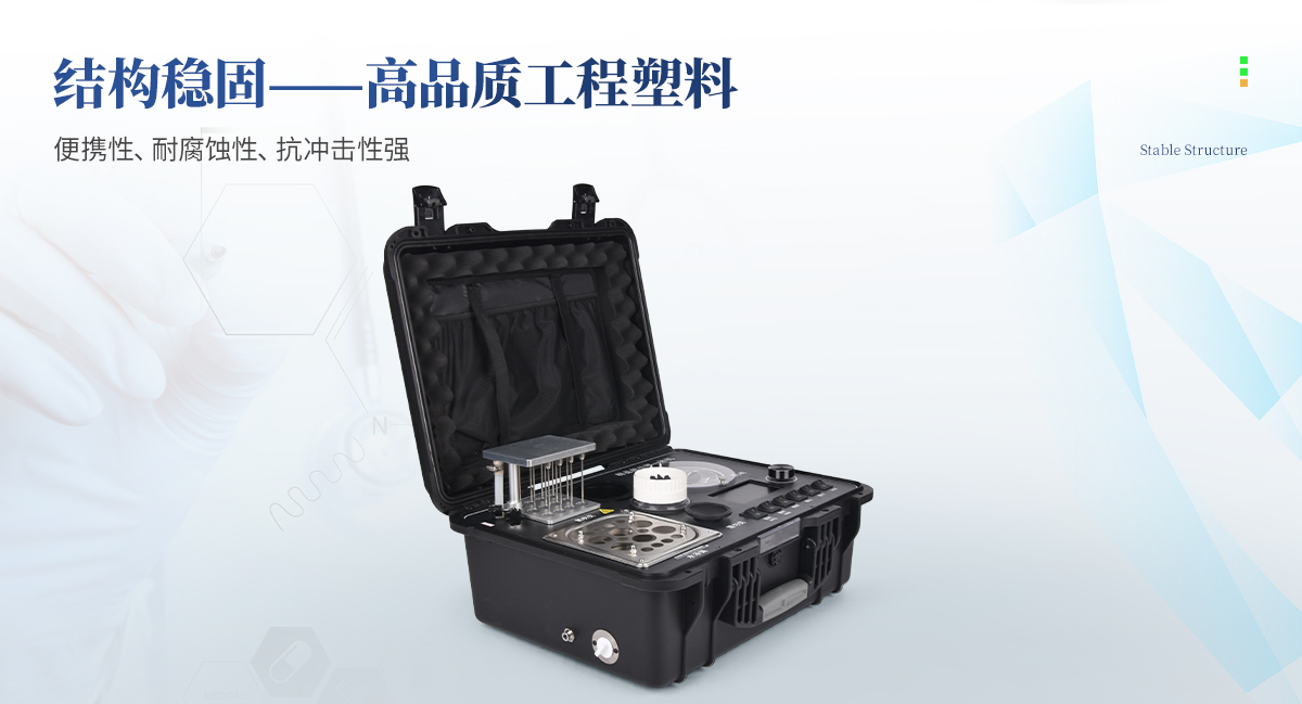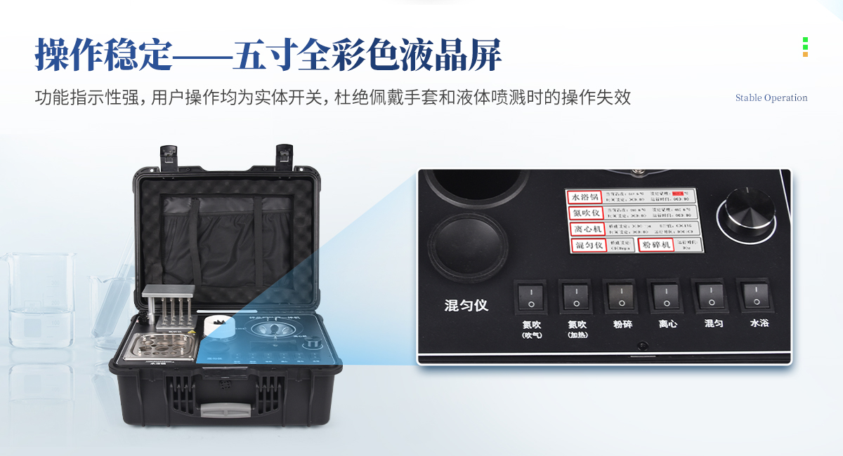 | 1、功能緊湊,集成五種樣品前處理常用的功能,完成樣品一站式處理。 | 2、結(jié)構(gòu)穩(wěn)固,機(jī)箱采用***工程塑料,具備**的抗沖擊性、耐腐蝕性、便攜性。 | 3、操作穩(wěn)定,機(jī)器采用五寸全彩色液晶屏,功能指示性強(qiáng),用戶操作均為實(shí)體開關(guān),杜絕佩戴手套和液體噴濺時(shí)的操作失效。 |