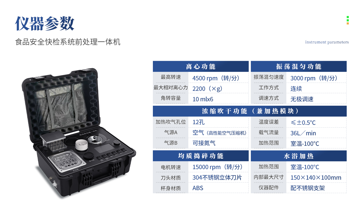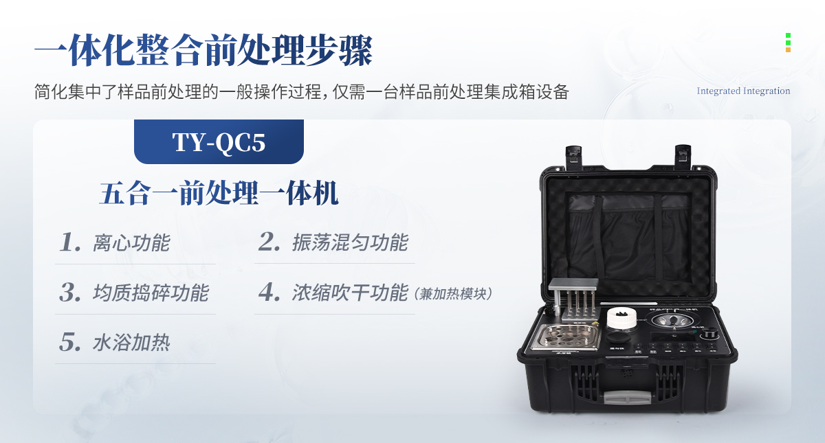 產(chǎn)品介紹: 應(yīng)國(guó)內(nèi)用戶的實(shí)際需求,自行研制開發(fā)的新型儀器——QC05型樣品前處理一體機(jī)。樣品前處理集成箱將樣本前處理過程中樣品濃縮、水浴恒溫、離心分層、均質(zhì)、振蕩混勻等步驟所需設(shè)備進(jìn)行集成,僅需一臺(tái)樣品前處理集成箱設(shè)備即可完成所有樣本前處理過程,并且方便攜帶,不僅適用于現(xiàn)場(chǎng)檢測(cè)使用,還可用