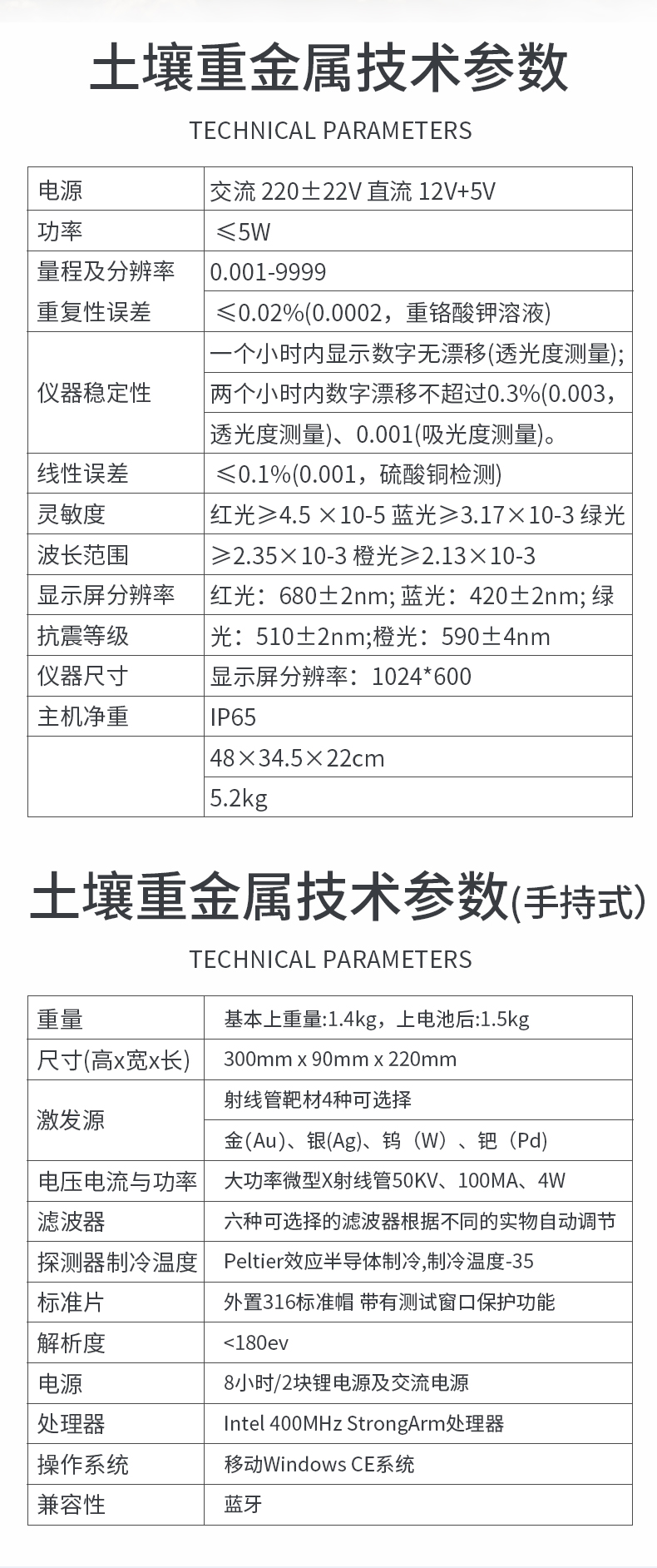 | 1.電源:交流 220±22V 直流 12V+5V(儀器內(nèi)置鋰電池也可用車載電源) | 2.功率: ≤5W | 3.量程及分辨率:0.001-9999 | 4.重復(fù)性誤差: ≤0.02%(0.0002,重鉻酸鉀溶液) | 5.儀器穩(wěn)定性:一個小時內(nèi)顯示數(shù)字無漂移(透光度測量);兩個小時內(nèi)數(shù)字漂移不超過0.3%(0.003,透光度測量)、0.001(吸光度測量)。 | 6.線性誤差: ≤0.1%(0.001,硫酸銅檢測) | 7.靈敏度:紅光≥4.5 ×10-5 藍(lán)光≥3.17×10-3 綠光≥2.35×10-3 橙光≥2.13×10-3 | 8.波長范圍 :紅光:680±2nm; 藍(lán)光:420±2nm; 綠光:510±2nm;橙光:590±4nm | 9.PH值(酸堿度): (1)測試范圍:1~14 (2)精度:0.01 (3)誤差:±0.1 | 10.含鹽量(電導(dǎo)):(1)測試范圍:0.01%~1.00% (2)相對誤差:±5% | 11.土壤水分技術(shù)參數(shù)水分單位:﹪(g/100g);含水率測試范圍:0-100﹪;誤差小于0.5% | 12.顯示屏分辨率:1024*600 | 13.抗震等級:IP65 | 14、儀器尺寸:48×34.5×22cm | 15、主機(jī)凈重:5.2kg |