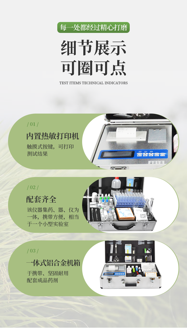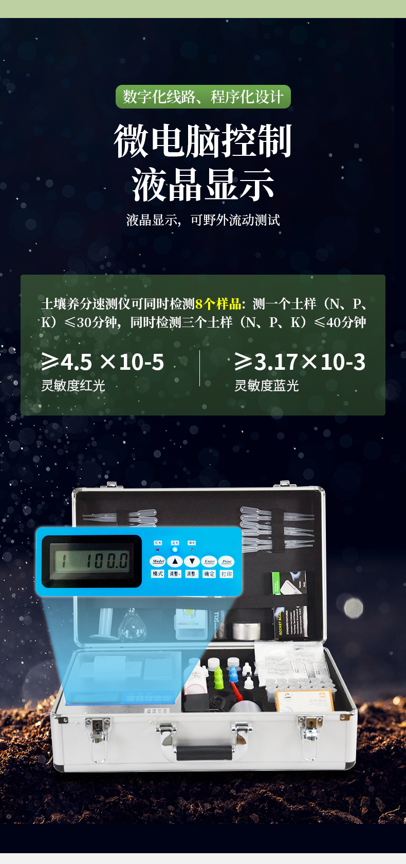 特點:《機箱/藥劑一體式鋁合金機箱》設計,便于攜帶、堅固耐用,配套成品藥劑。微電腦控制,數(shù)字化線路、程序化設計,液晶顯示,交直流兩用,可野外流動測試,大程度降低操作者的失誤和勞動強度。分辨率:0.001,觸摸式按鍵,內(nèi)置熱敏打印機,可打印測試結(jié)果??蓹z測土壤及化肥、有機肥、植株中的速效氮、有效磷、速效鉀、