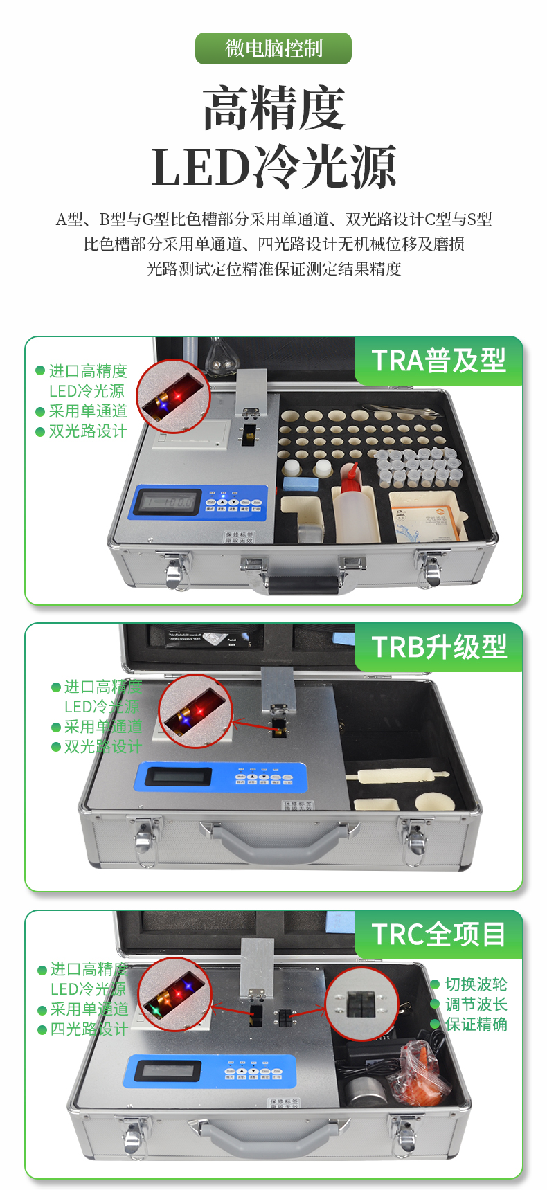 | 1、《機箱/藥劑一體式鋁合金機箱》設計,便于攜帶、堅固耐用,配套成品藥劑。 | 2、微電腦控制,數(shù)字化線路、程序化設計,液晶顯示,交直流兩用,可野外流動測試,大程度降低操作者的失誤和勞動強度。 | 3、分辨率:0.001,觸摸式按鍵,內(nèi)置熱敏打印機,可打印測試結(jié)果。 | 4、可檢測土壤及化肥、有機肥、植株中的速效氮、有效磷、速效鉀、全氮、全磷、全鉀、有機質(zhì)含量,土壤酸堿度,含鹽量(擴展)。 | 5、土壤養(yǎng)分速測儀采用高亮度 LED 燈作為光源, 硅半導體作為信號接收系統(tǒng), 壽命長達10萬小時級別。光源穩(wěn)定,一致性好。 | 6、比色槽部分采用單通道、雙光路設計,無機械位移及磨損,光路測試定位**,保證測定結(jié)果精度。 |