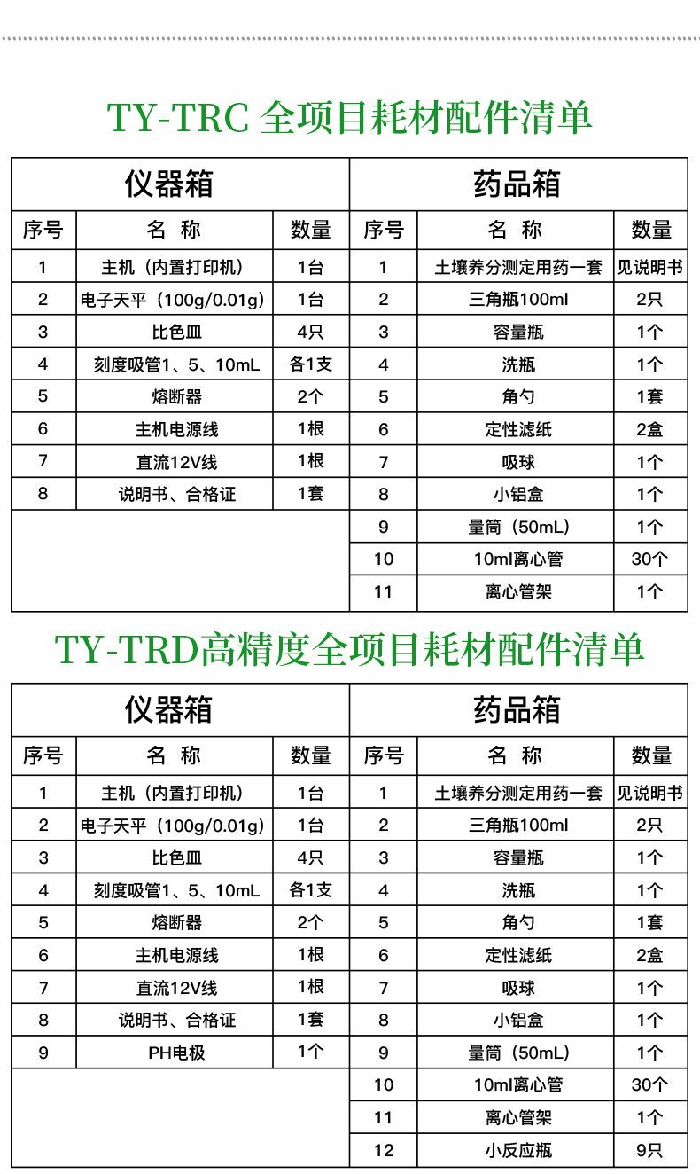 | 主機(內(nèi)置打印機) 1臺 | 比色皿 4只 | 電子天平(100g/0.01g) 1臺 | 電源適配器 1個 | 吸管(3mL) 12支 | 洗瓶 1個 | 稱樣勺 1套 | 定性濾紙 1盒 | 小鋁盒 1個 | 容量瓶 1個 | 量筒(50mL) 1個 | 浸提瓶 2個 | 反應試管 18個 | 土壤養(yǎng)分測定試劑 1套 | 說明書、合格證、保修卡 1套 |