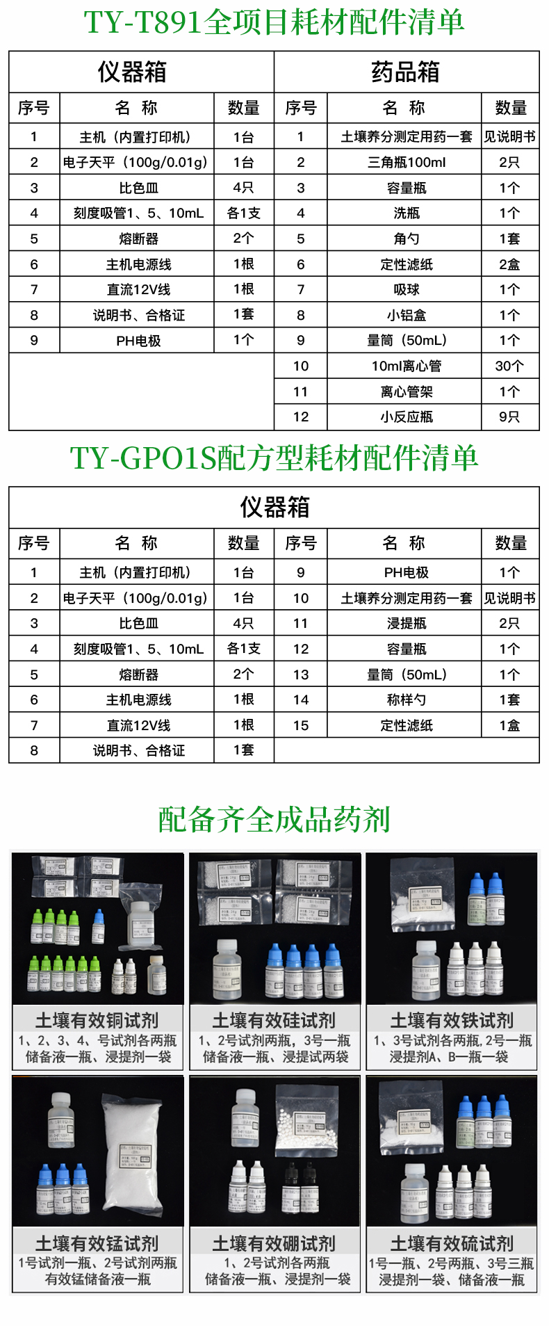 | 藥 品 箱 | 土壤養(yǎng)分測定用藥一套:見說明書 | 三角瓶100ml :2只 | 容量瓶 :1個(gè) | 洗瓶 :1個(gè) | 角勺 :1套 | 定性濾紙 :1盒 | 吸球 :1個(gè) | 小鋁盒 :1個(gè) | 量筒(50mL) :1個(gè) | 10ml離心管 :30個(gè) | 離心管架 :1個(gè) |
