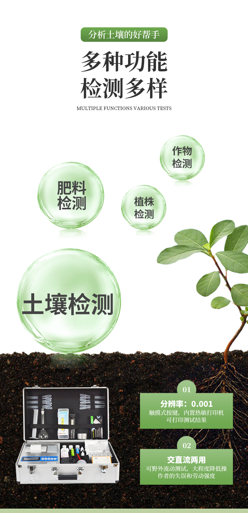 | 全項(xiàng)目土壤肥料養(yǎng)分檢測(cè)儀功能全:測(cè)試項(xiàng)目國(guó)內(nèi)外最全(各類(lèi)藥劑均可選購(gòu))。 | 配套齊全:該儀器集藥、器、儀為一體,攜帶方便,相當(dāng)于一個(gè)小型實(shí)驗(yàn)室。適于農(nóng)業(yè)服務(wù)部門(mén)或農(nóng)資經(jīng)銷(xiāo)商、肥料廠(chǎng)商測(cè)土施肥和鑒別肥料真假。 | 操作簡(jiǎn)便、速度快捷,成品藥劑開(kāi)瓶即用,無(wú)須配置。 |