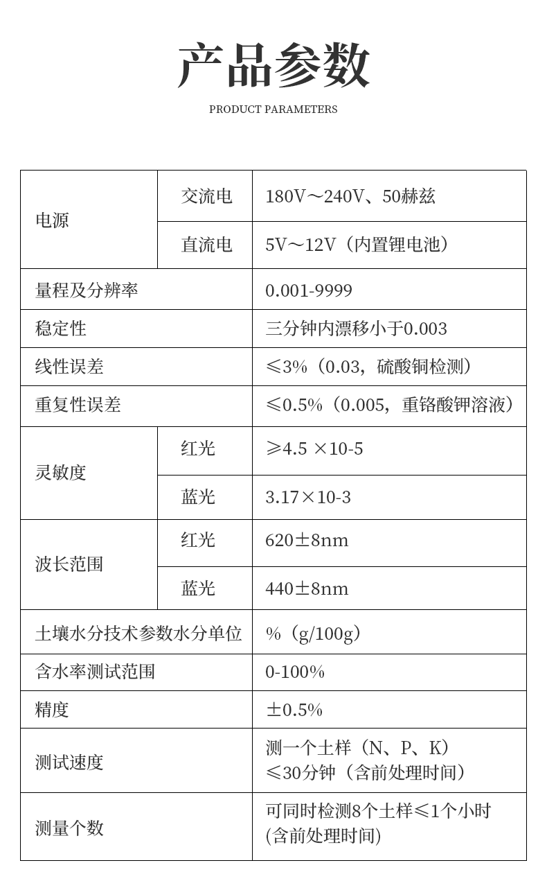 | 1.電源:交流 220±22V 直流 12V+5V(可用車(chē)載電源也可選擇儀器內(nèi)置鋰電池) | 2.功率: ≤5W | 3.量程及分辨率:0.001-9999 | 4.重復(fù)性誤差: ≤0.3%(0.003,重鉻酸鉀溶液) | 5.儀器穩(wěn)定性:一個(gè)小時(shí)內(nèi)漂移小于0.3%(0.003,透光度測(cè)量)。儀器開(kāi)機(jī)預(yù)熱5分鐘后,三十分鐘內(nèi)顯示數(shù)字無(wú)漂移(透光度測(cè)量);一個(gè)小時(shí)內(nèi)數(shù)字漂移不超過(guò)0.3%(透光度測(cè)量)、0.001(吸光度測(cè)量);兩個(gè)小時(shí)內(nèi)數(shù)字漂移不超過(guò)0.5%(0.005,透光度測(cè)量)。 | 6.線(xiàn)性誤差: ≤0.2%(0.002,硫酸銅檢測(cè)) | 7.靈敏度:紅光≥4.5 ×10-5 藍(lán)光≥3.17×10-3 綠光≥2.35×10-3 橙光≥2.13×10-3 | 8.波長(zhǎng)范圍 :紅光:680±2nm; 藍(lán)光:420±2nm; 綠光:510±2nm;橙光:590±4nm | 9.PH值(酸堿度): (1)測(cè)試范圍:1~14 (2)精度:0.01 (3)誤差:±0.1 | 10.含鹽量(電導(dǎo)):(1)測(cè)試范圍:0.01%~1.00% (2)相對(duì)誤差:±5% | 11.土壤水分技術(shù)參數(shù)水分單位:﹪(g/100g);含水率測(cè)試范圍:0-100﹪;誤差小于0.5% | 12.土壤中速效N、P、K三種養(yǎng)分一次性同時(shí)浸提測(cè)定、科學(xué)推薦施肥量(農(nóng)業(yè)部速測(cè)行業(yè)標(biāo)準(zhǔn)起草者) | 13.肥料中氮(N)、磷(P)、鉀(K)等養(yǎng)分同時(shí)、快速、準(zhǔn)確檢測(cè)(發(fā)明專(zhuān)利技術(shù)) | 14.測(cè)試速度:測(cè)一個(gè)土樣(N、P、K)≤30分鐘(含前處理時(shí)間,不需用戶(hù)提供任何附件) | 15.同時(shí)測(cè)8個(gè)土樣≤1小時(shí)(含前處理時(shí)間) | 16.數(shù)據(jù)打印:內(nèi)置**一鍵式熱敏打印機(jī) |