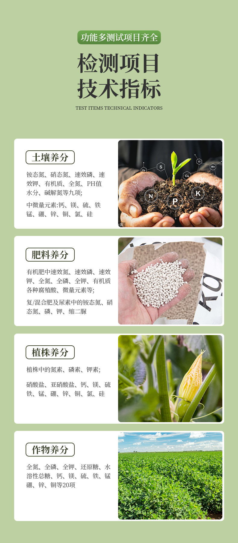| 肥料養(yǎng)分:● 單質(zhì)化肥中的氮、磷、鉀; ● 復(fù)(混)合肥及尿素中的銨態(tài)氮、磷、鉀; ● 有機(jī)肥中速效氮、速效磷、速效鉀、全氮、全磷、全鉀、pH、有機(jī)質(zhì)等。 |