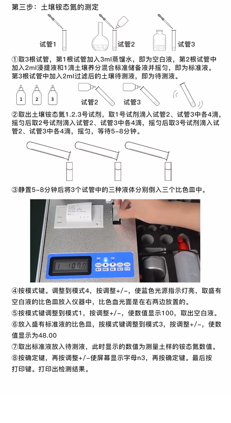 | 全國(guó)《機(jī)箱/藥劑一體式鋁合金機(jī)箱》設(shè)計(jì),便于攜帶、堅(jiān)固耐用,配套成品藥劑。 | 微電腦控制,數(shù)字化線路、程序化設(shè)計(jì),液晶顯示,交直流兩用,測(cè)試數(shù)據(jù)可存儲(chǔ)查詢,可野外流動(dòng)測(cè)試,最大程度降低操作者的失誤和勞動(dòng)強(qiáng)度。 | 分辨率:0.001,觸摸式按鍵,內(nèi)置新一代熱敏打印機(jī),可打印測(cè)試結(jié)果。 | 肥料養(yǎng)分專用快速檢測(cè)儀可檢測(cè)化肥、有機(jī)肥中的速效氮、速效磷、有效鉀、全氮、全磷、全鉀、有機(jī)質(zhì)含量等。 | 采用高亮度 LED 燈作為光源, 硅半導(dǎo)體作為信號(hào)接收系統(tǒng), 壽命長(zhǎng)達(dá)10萬(wàn)小時(shí)級(jí)別。光源穩(wěn)定,一致性好。 | 比色槽部分采用單通道、雙光路設(shè)計(jì),無(wú)機(jī)械位移及磨損,光路測(cè)試定位**,保證測(cè)定結(jié)果精度。 | 采用自主發(fā)明分析方法,保證檢測(cè)結(jié)果絕對(duì)達(dá)到國(guó)標(biāo)要求。 | 肥料打印結(jié)果為百分含量,測(cè)試誤差小于1%。 |
