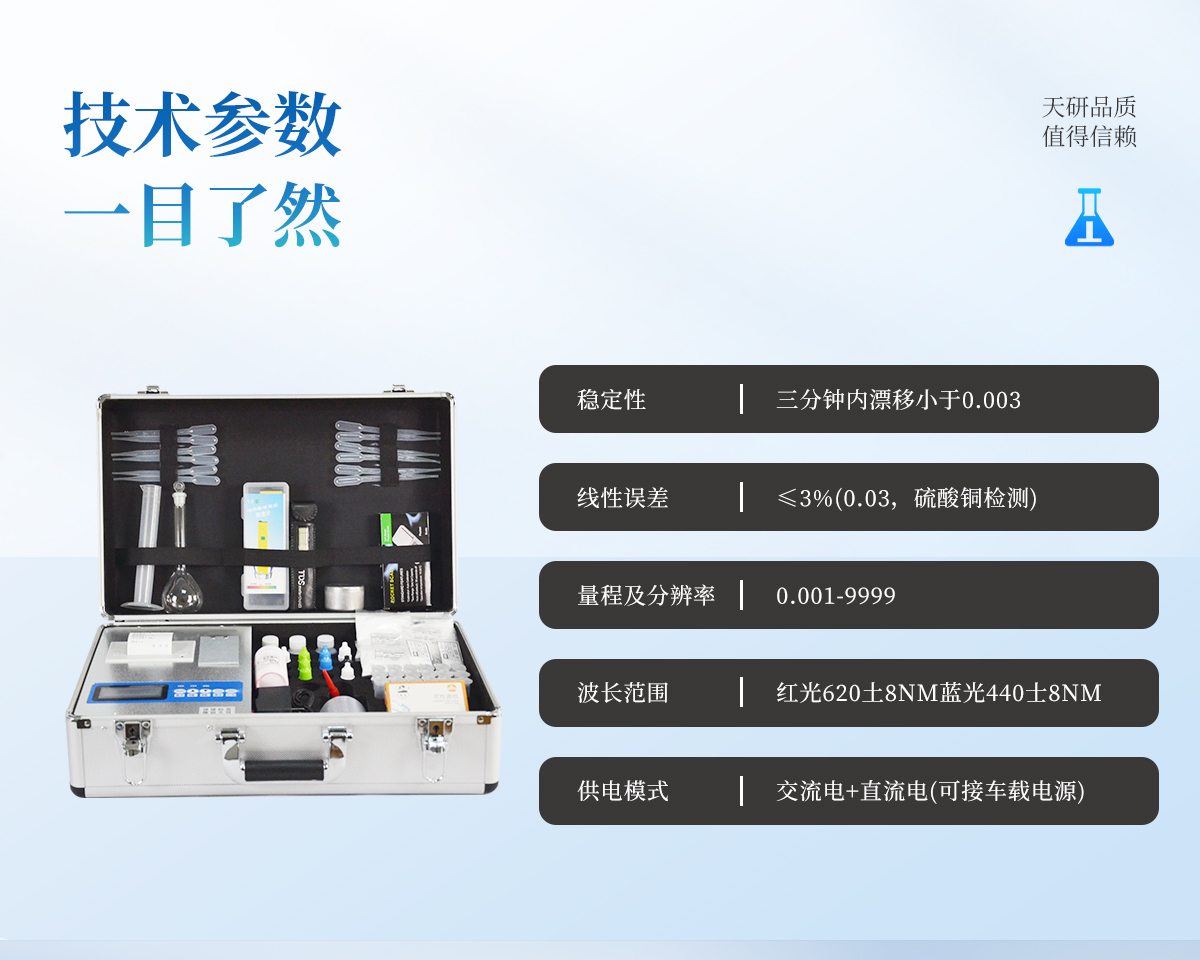 特點(diǎn): 全國(guó)獨(dú)家《機(jī)箱/藥劑一體式鋁合金機(jī)箱》專利設(shè)計(jì),便于攜帶、堅(jiān)固耐用,配套檢測(cè)方法及成品藥劑。 微電腦控制,數(shù)字化線路、程序化設(shè)計(jì),液晶顯示,交直流兩用,測(cè)試數(shù)據(jù)可存儲(chǔ)查詢,可野外流動(dòng)測(cè)試,最大程度