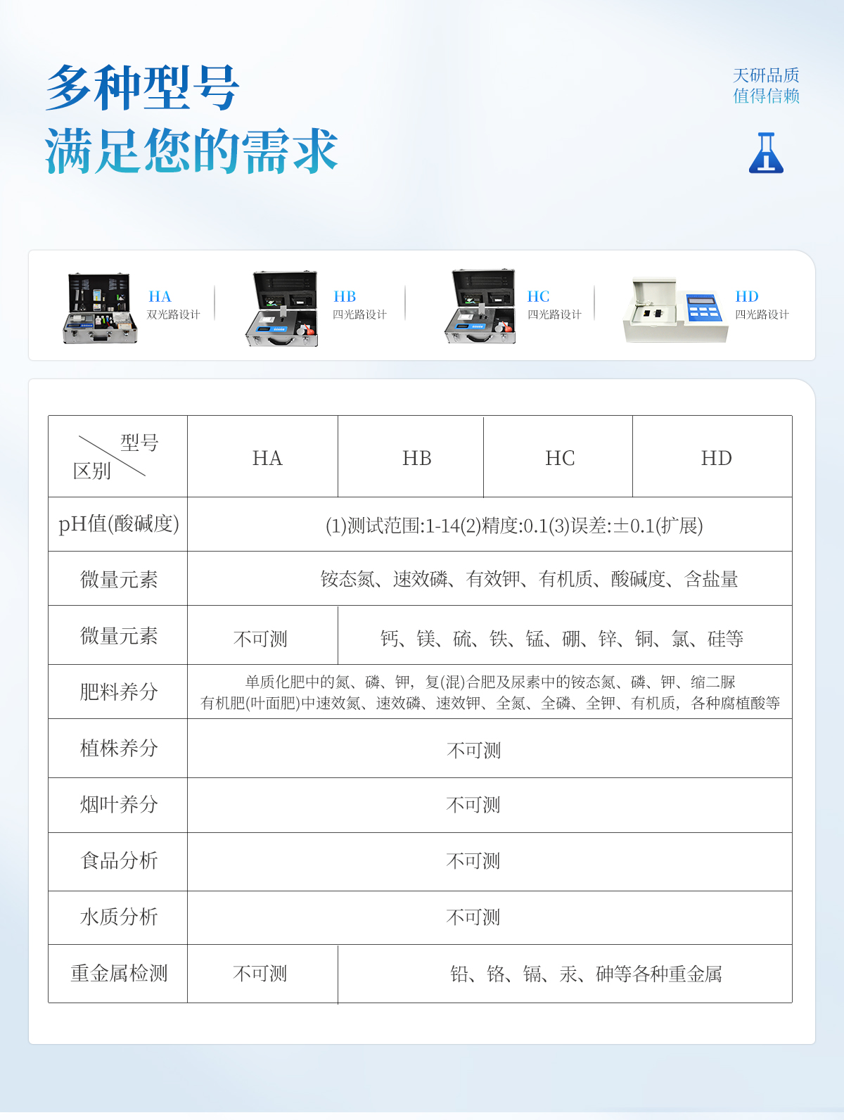 | 化肥養(yǎng)分:● 單質(zhì)化肥中的氮、磷、鉀; ● 復(fù)(混)合肥及尿素中的銨態(tài)氮、硝態(tài)氮、磷、鉀、縮二脲; | 有機(jī)肥養(yǎng)分:● 有機(jī)肥中速效氮、速效磷、速效鉀、全氮、全磷、全鉀、有機(jī)質(zhì),各種腐植酸、微量元素(鈣、鎂、硫、鐵、錳、硼、鋅、銅、氯、硅、鉬)等以及各種重金屬(鉛、鉻、鎘、汞、砷、鎳、鋁、氟、鈦、硒)。 |