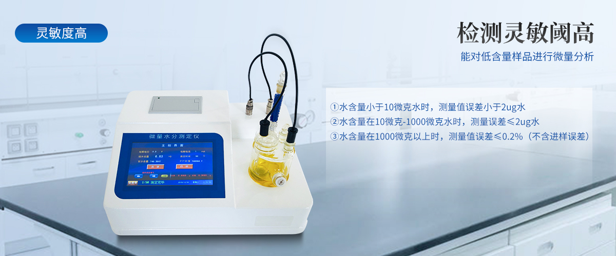 | 微量水分測定儀根據卡爾-菲休滴定原理,采用**的微機電路,測定性質不同的液體、固體中微量水分的含量。對于不溶于試劑的固體,以及與試劑起化學反應的或容易污染電極的物質,可配用相應的固體、液體進樣器,進行間接測定。 | 該儀器具有測定精度高、分析速度快、使用范圍廣、穩(wěn)定可靠、操作簡單等優(yōu)點。廣泛用于電力、石油、化工、農藥、醫(yī)藥等行業(yè)。樣品測定過程由儀器自動控制,攪拌、測定60秒左右自動完成,直接顯示測定結果;全密封滴定池瓶,避免試劑與人接觸,也避免環(huán)境濕度的影響; |