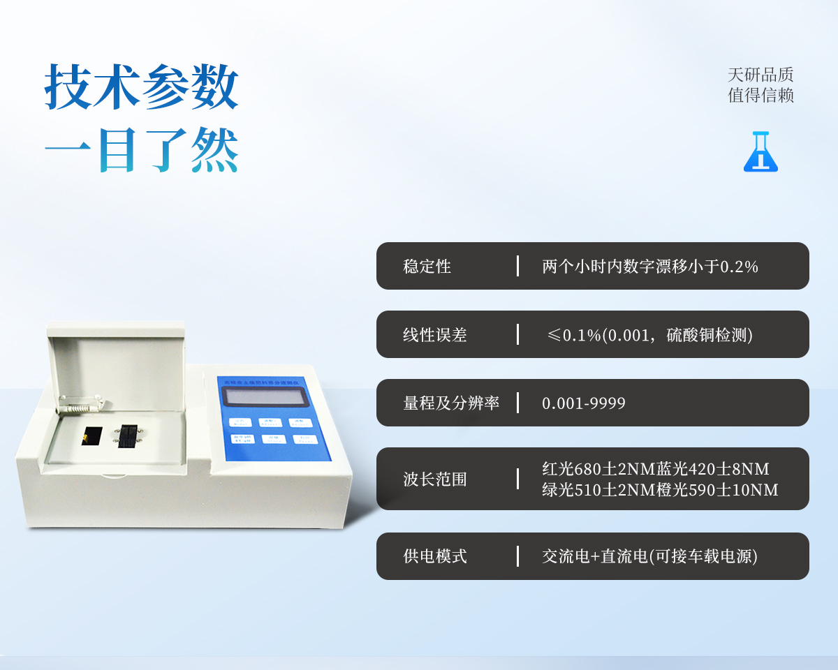 特點: 升級款,噴塑鋼板外殼設計,堅固耐用,配套成套附件及成品藥劑。 微電腦控制,數字化線路、程序化設計,液晶顯示,交直流兩用,可野外流動測試。 分辨率:0.001,觸摸式按